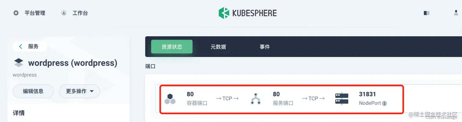 点击服务进入详情页,可以在端口处查看暴露的端口。