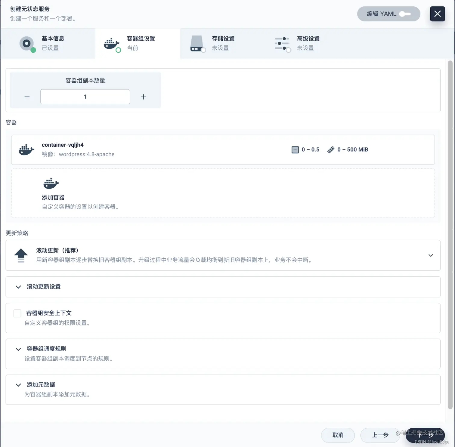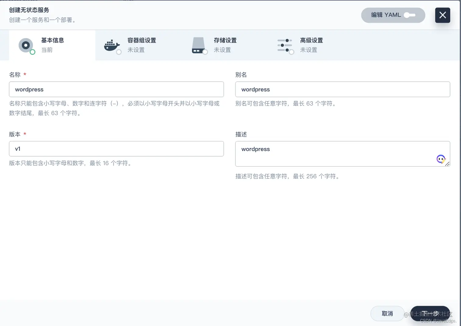 wordpress-pvc),然后点击下一步。 - 在存储设置中,需要选择一个可用的存储类,并设置访问模式和卷容量。用默认值,下一步