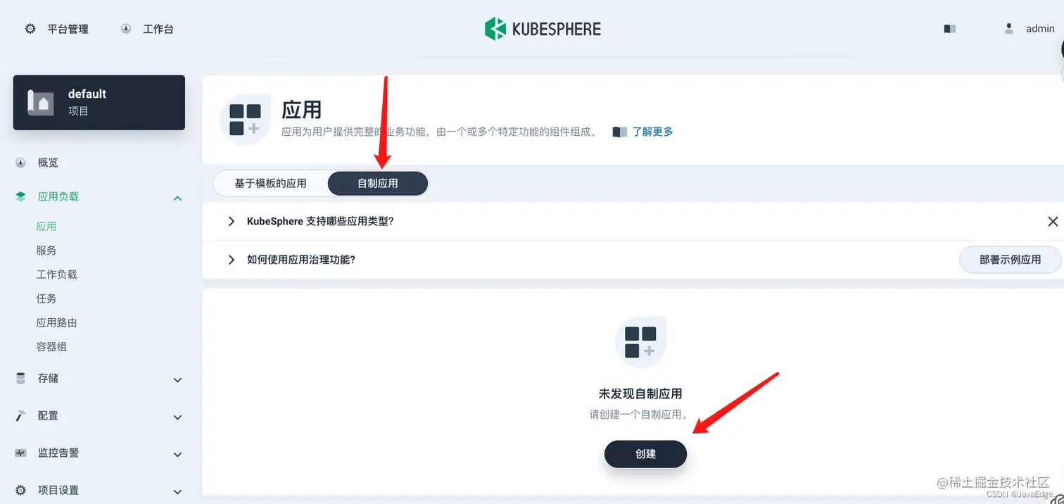 导航到应用负载下的应用,选择自制应用 > 创建。