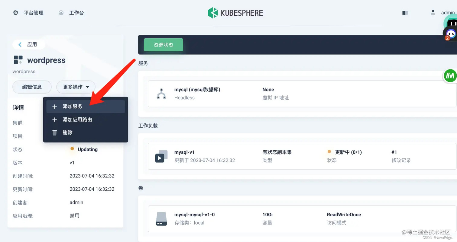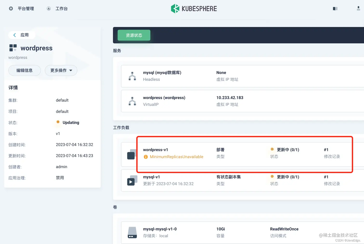 在工作负载中,分别检查部署和有状态副本集中 wordpress-v1 和 mysql-v1 的状态。如果它们的运行状态为运行中,就意味着 WordPress 已经成功创建。