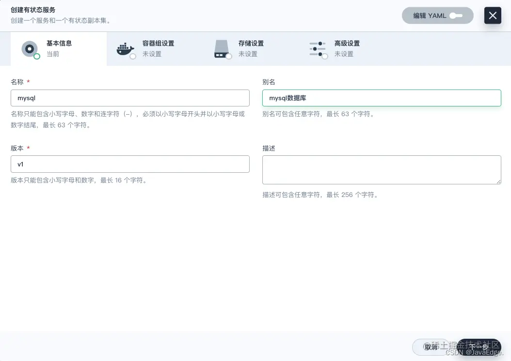 输入有状态服务的名称(例如 mysql)并点击下一步。