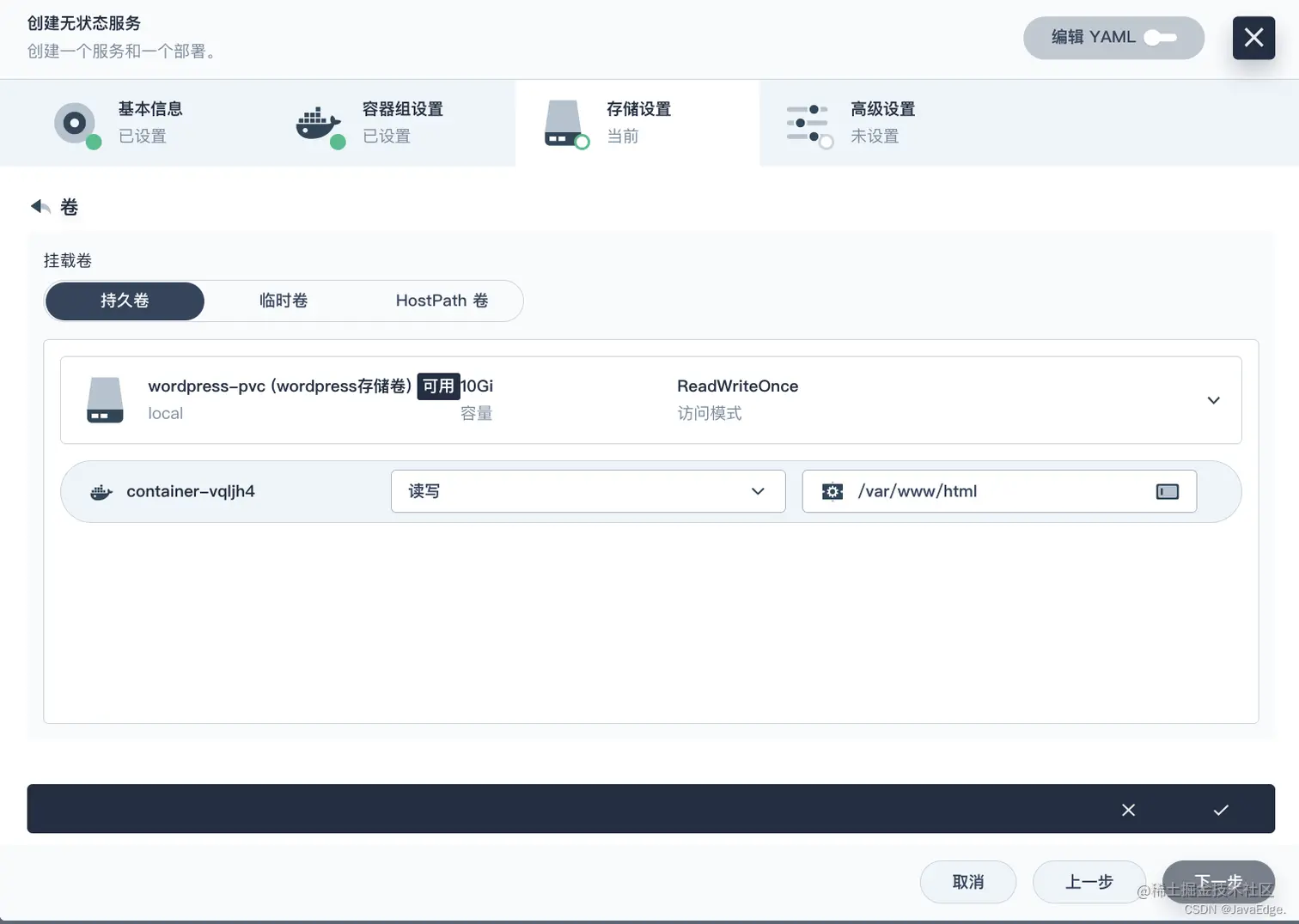 wordpress-pvc,将模式设置为读写,并输入挂载路径/var/www/html。点击 √ 保存,再点击下一步继续。 -