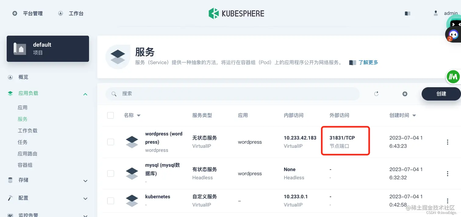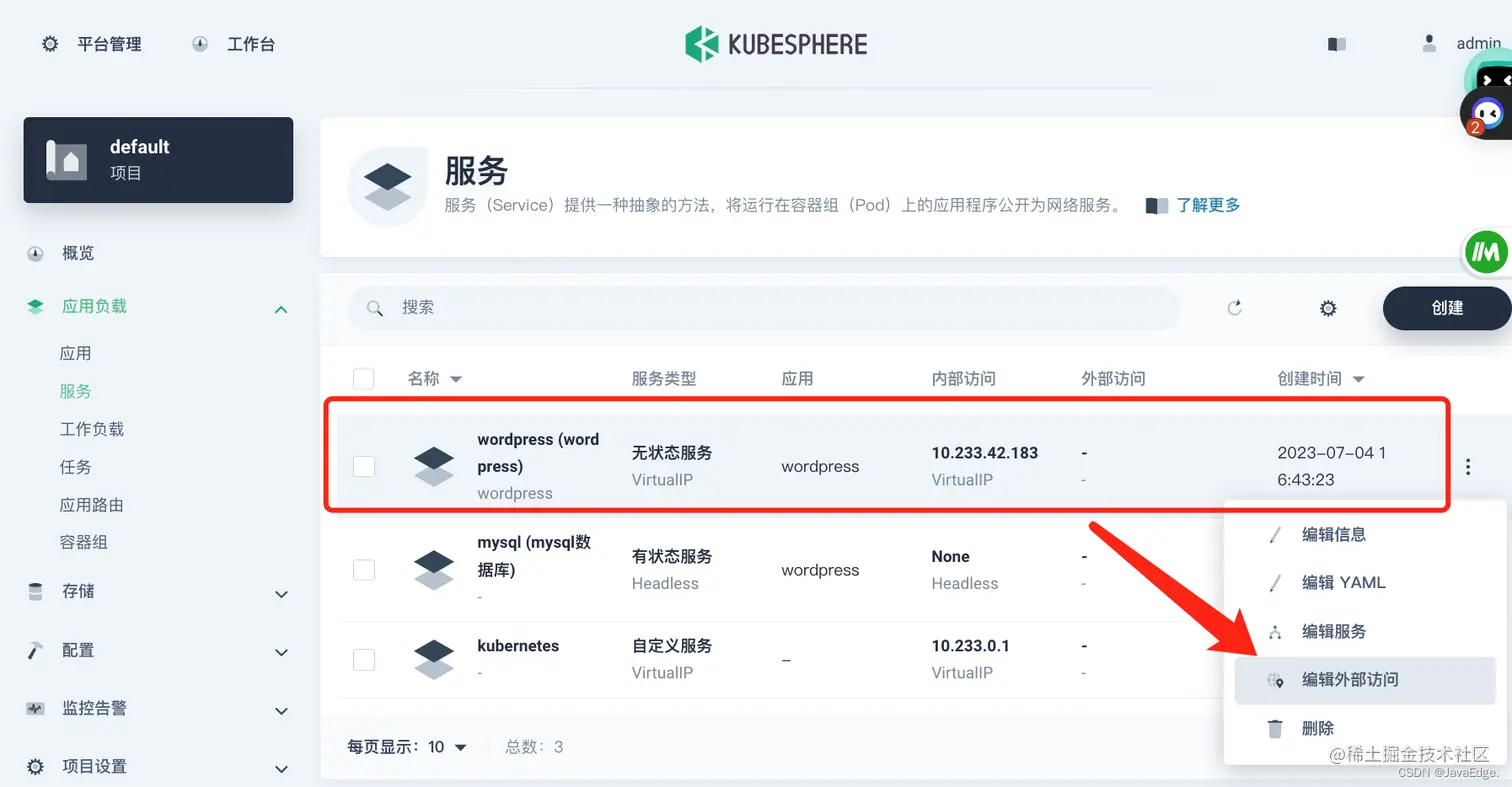 若要在集群外访问服务,选择左侧导航栏中的应用负载 > 服务。点击