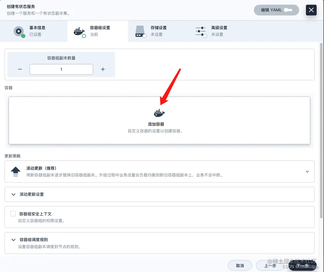 在容器组设置中,点击添加容器。
