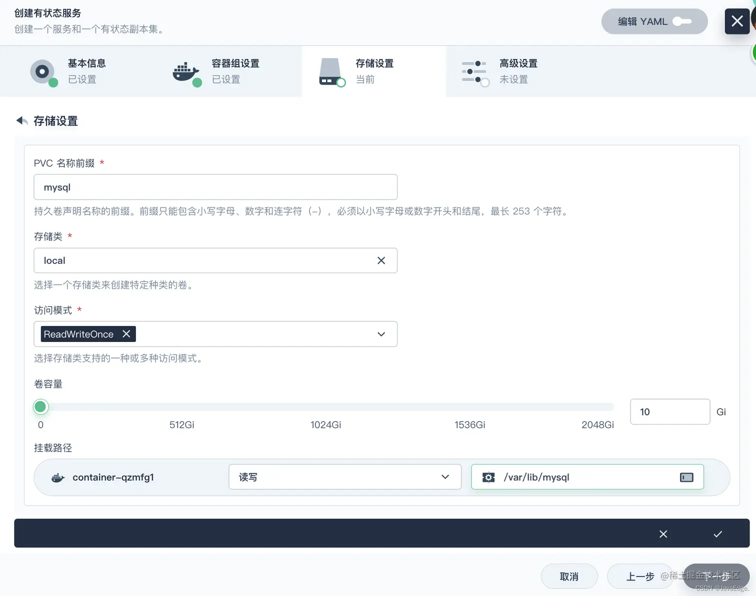 选择存储设置中的添加持久卷声明模板,输入 PVC 名称前缀 (
