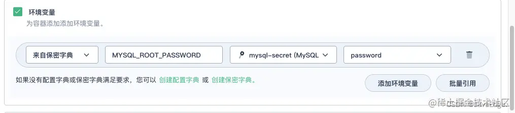 MYSQL_ROOT_PASSWORD,然后选择资源mysql-secret和前面步骤中创建的密钥MYSQL_ROOT_PASSWORD,完成后点击 √ 保存配置,点击下一步。 -