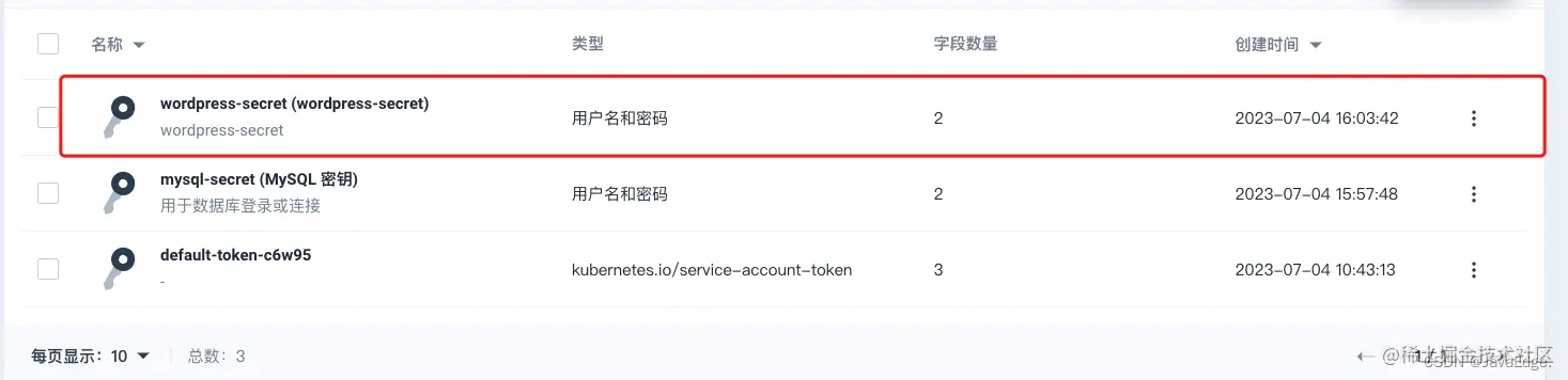 同理创建一个名为 wordpress-secret 的 WordPress 密钥,输入键 (Key) WORDPRESS_DB_PASSWORD 和值 (Value) 123456。创建的密钥显示在列表中。