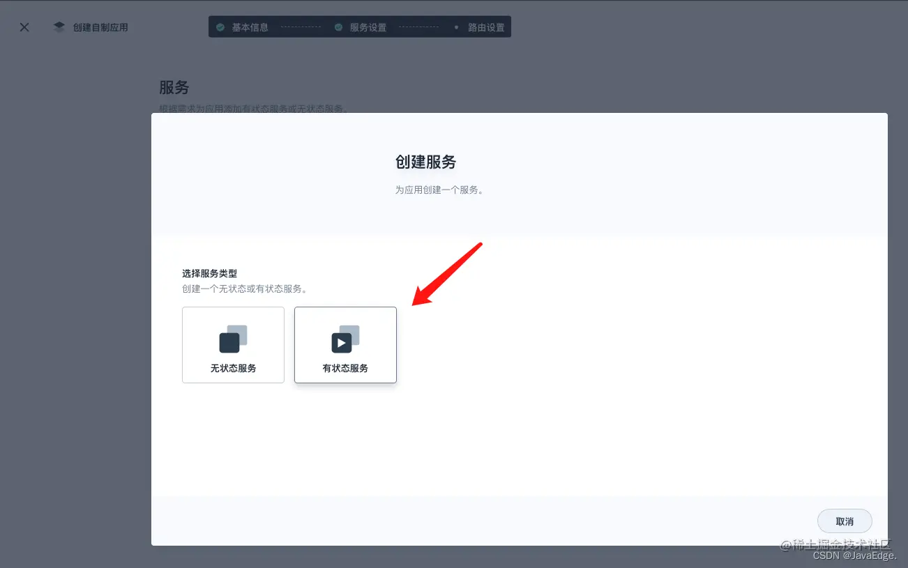 再次点击创建服务,选择无状态服务。输入名称
