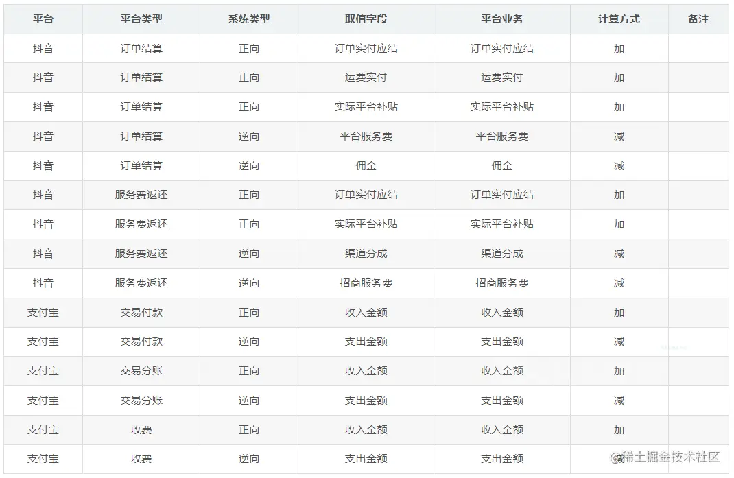 3、为了实现抖音账单正逆向金额的区分,我们引入一张平台金额计算配置表,以期实现根据每条数据的不同字段,获取对应的金额。平台金额计算配置表设置为如下: