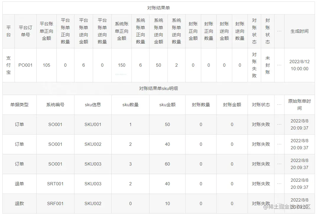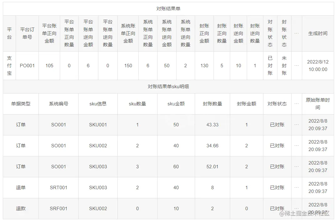 - 对账结果单主表封账金额=系统金额,对账结果单sku明细表中的封账金额=sku金额。
