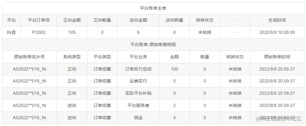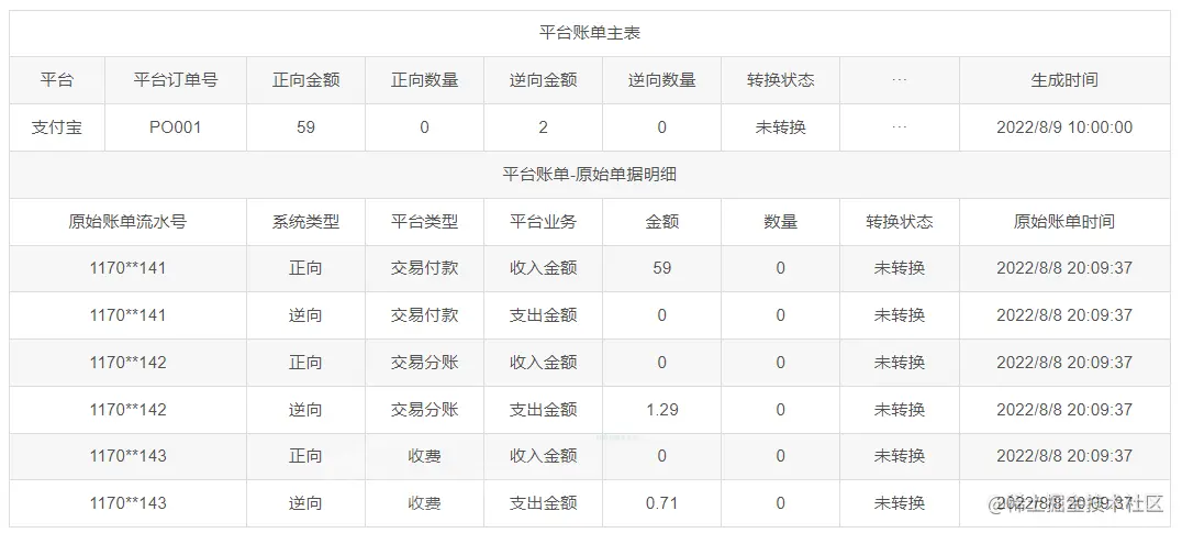 上述表中的序号1数据详情页如下,根据平台单号将多条原始账单数据聚合到一个平台账单中,明细数据是根据将对应的每一条原始账单数据拆分成正向和逆向两类。
