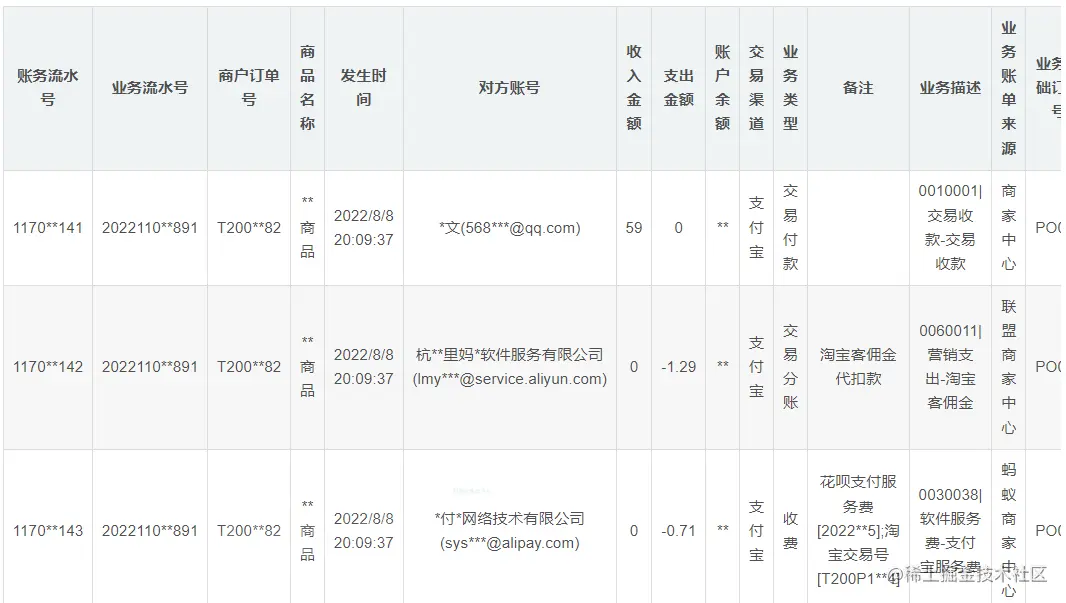 2、每个账单的资金流水在一条数据的不同字段体现(以抖音原始账单为代表 ):