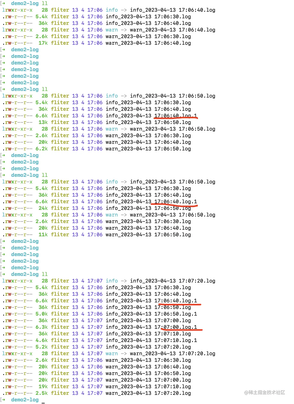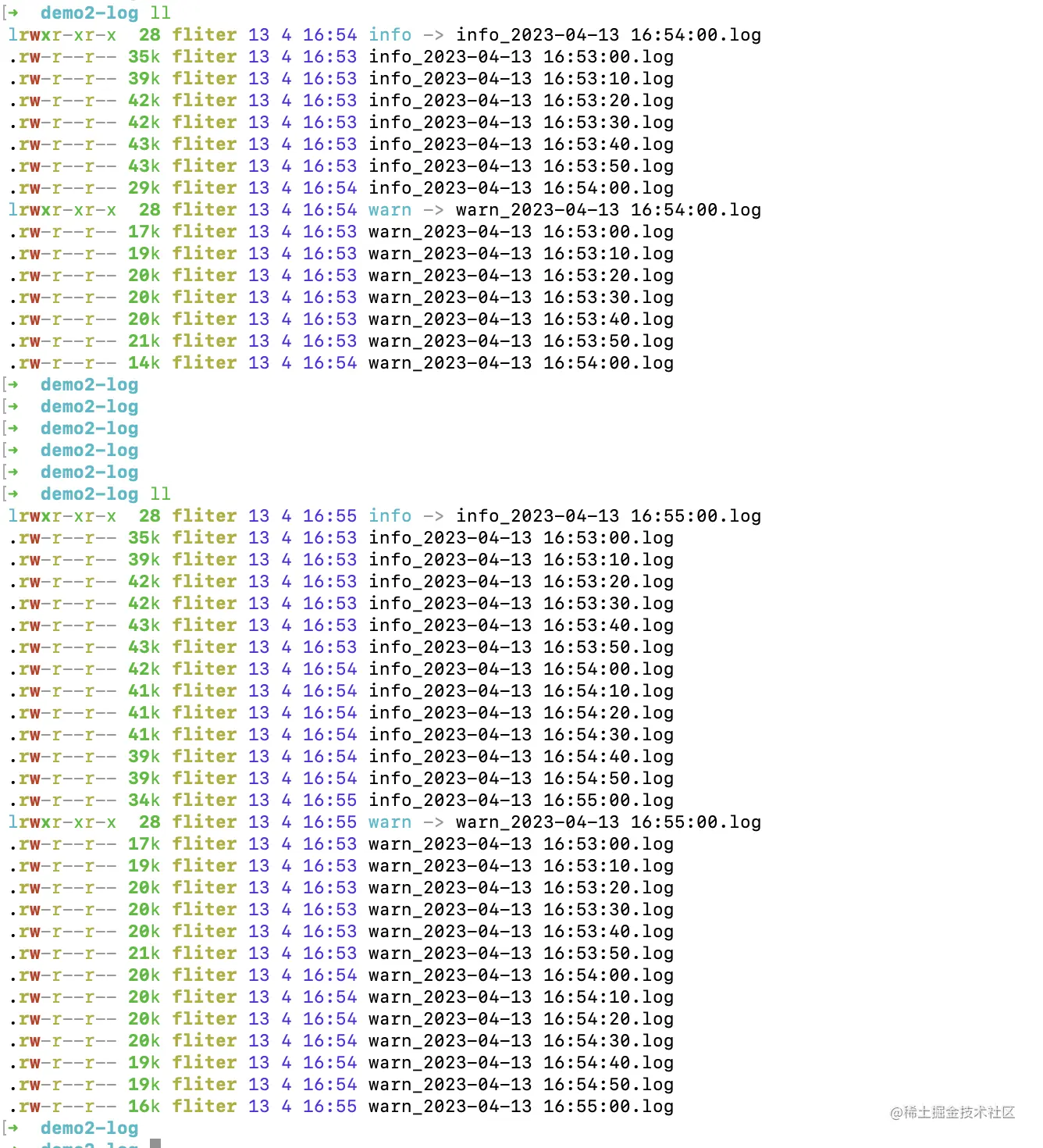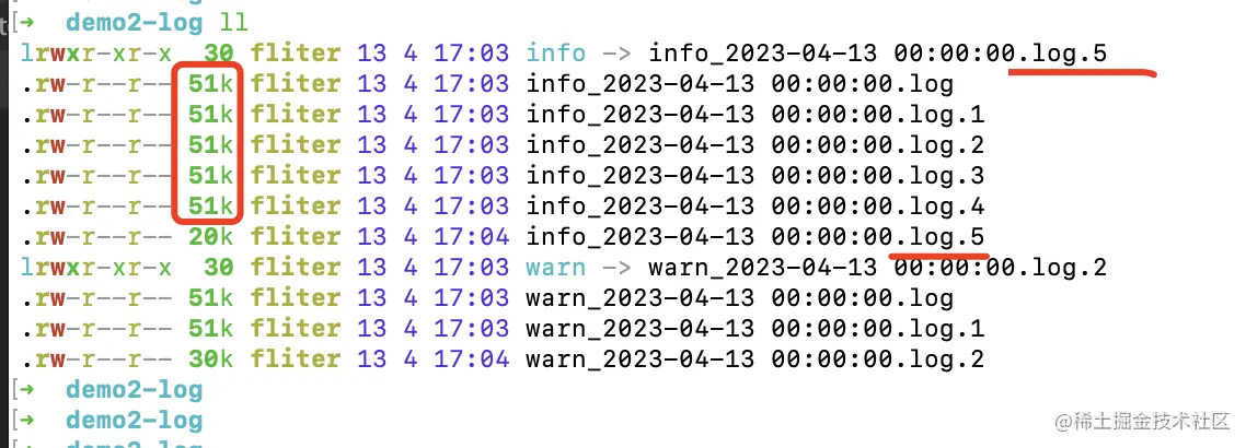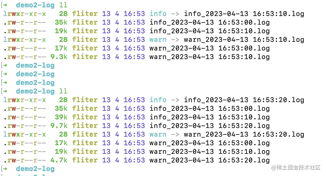 例如,当info级别的日志文件到达2M时,会根据当时的时间戳,切分出一个info-2023-04-13T05-27-18.296.log。 后续新写入的info级别的日志将写入到info.log,直到又到达2M,继续会切分。