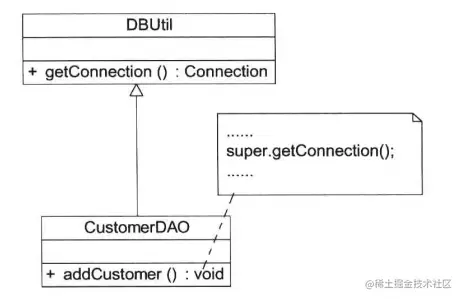 CustomerDAO类通过继承DBUtil类的方式,实现对连接数据库的方法getConnection的调用