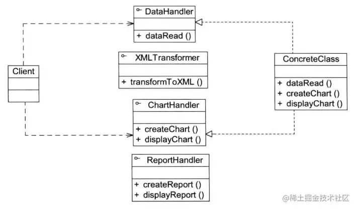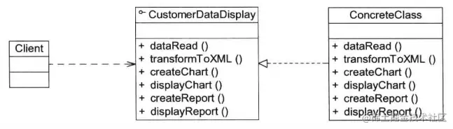 ConcreteClass作为客户端,实现了CustomerDataDisplay接口,其中transformToXML方法可以将数据文件转换为XML格式