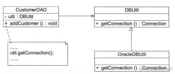 - 若要将数据库更改为Oracle数据库,原有的getConnection方法便无法使用,要想使用新的连接方法,就必须修改CustomerDAO类的继承关系,继承OracleDBUtil类,或者修改DBUtil的代码,这两种方法均违反了开闭原则