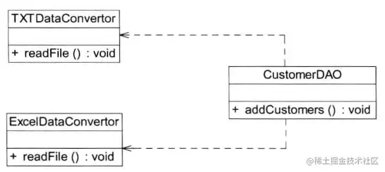 执行addCustomers方法时,需要对TXT格式或者Excel格式的数据源文件进行转换,而每次执行的时候只能选择其中的一种转换方式,若要修改转换方式,那么只能通过更改实现类或者新增实现类的方式进行修改,而直接修改代码的方式并不符合开闭原则。