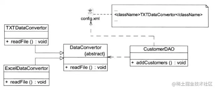 - 引入抽象数据转换类DataConvertor,CustomerDAO针对抽象类进行编程,而具体的数据转换类名则由配置文件config.xml给出,符合依赖倒转原则