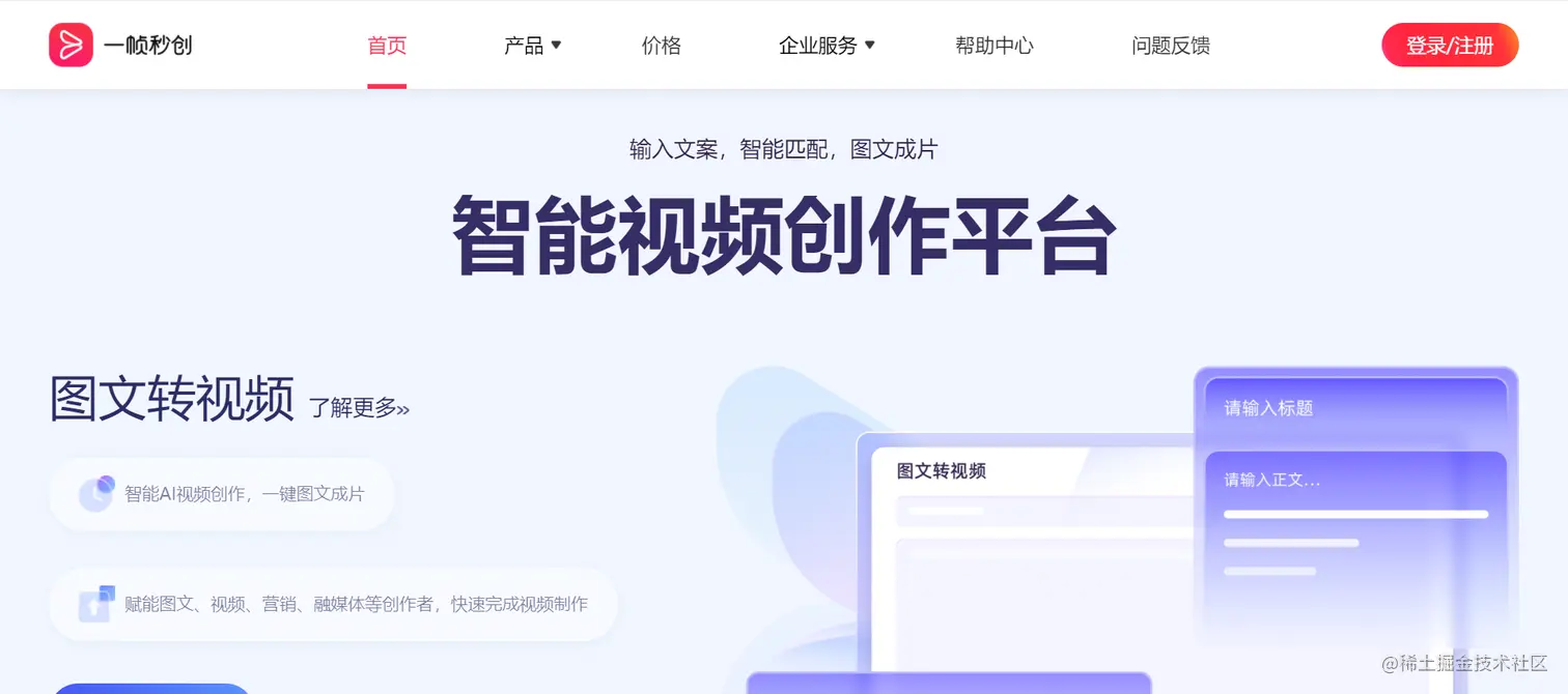一帧秒创是基于秒创引擎的智能AI内容生成平台,为创作者和机构提供AI生成服务,包括文字续写、文字转语音、文生图、图文转视频等创作服务,一帧秒创通过对文案、素材、AI语音、字幕等进行智能分析,快速成片,零门槛创作视频。