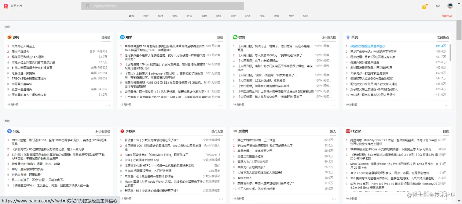 除了首页的各大平台热搜展示,今日热榜还提供其他类别的咨询查询,如综合类、科技类、娱乐类、社区类等等。用户也可以直接在搜索框输入自己感兴趣的内容,一站式了解多平台信息。