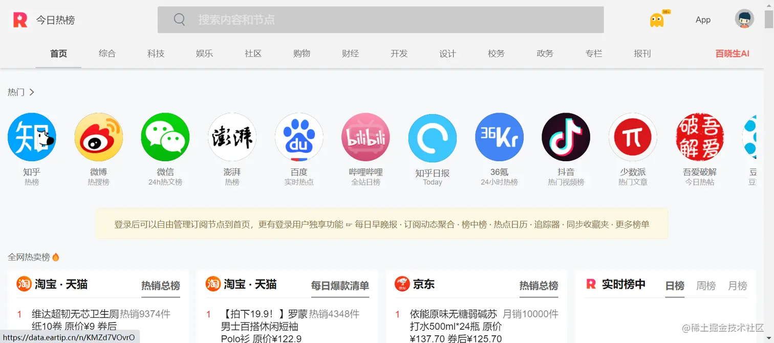 今日热榜是一款实时更新每日热点的网站,主要作用功能是资讯汇总,如果你不想花费太多时间找热门话题,又想知道每天的热点,那这个工具非常适合你。该网站把各大APP的排行榜都收录了过来了,轻松追踪全网热点。榜单及热门内容覆盖了微信、知乎、微博、抖音、百度、今日头条、豆瓣、哔哩哔哩等等,你常见的、你不常见的上百个平台实时热榜,一网打尽。