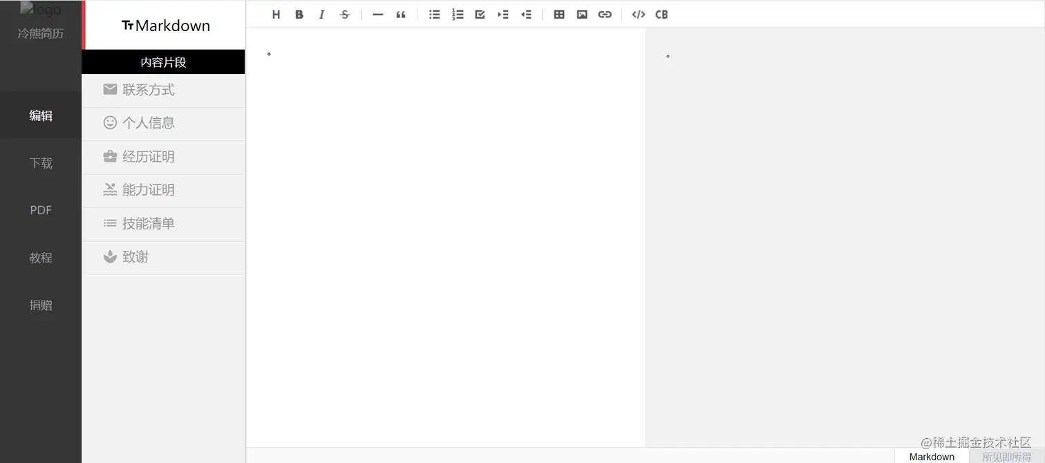 冷熊简历是一个基于Markdown编辑器的在线简历制作工具,除了拥有Markdown的功能外,还提供实时预览,一键PDF,含常用片段,内容自动保存,以前建立都是再word文档里制作,现在可以很方便的在线制作简历。