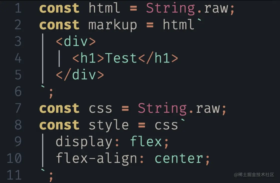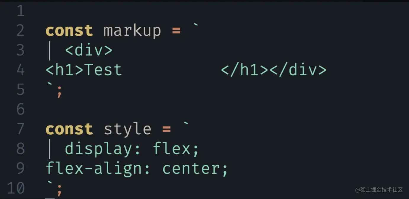 举个例子,我们在JS文件中定义两个变量(markup与style),IDE此时只认为这是两个普通的模版字符串(没有语法高亮):