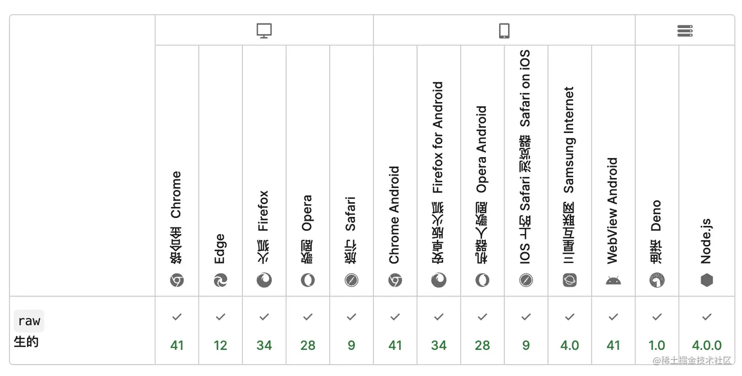 JS中只有一个内置标签函数 —— String.raw,用于获取模字符串的原始字符串形式,即: