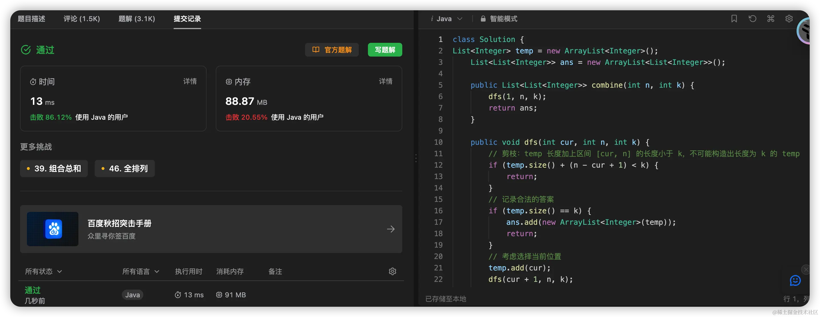 // 剪枝:temp 长度加上区间 [cur, n] 的长度小于 k,不可能构造出长度为 k 的 temp