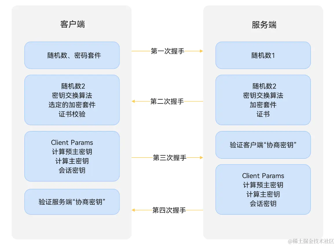 服务端利用 Client Random、Server Random 以及 Client Params 计算得出“会话密钥”,向客户端传递“Change Cipher Spec”和“Encrypted Handshake Message”消息供客户端校验。当双方校验通过后,真正的数据才开始传输。
