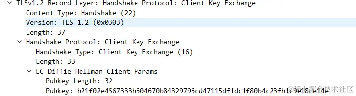 客户端收到“Server Hello Done”消息后,会将 Client Params 数据传递给服务端,其中包含自身生成的椭圆曲线公钥(Pubkey),数据内容如图所示: