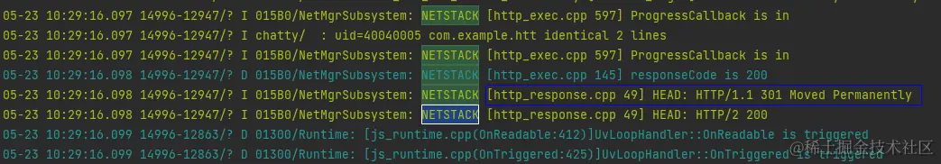 将本篇 Codelab 中的网址协议头更改为 http 时,在 DevEco Studio 的日志中看到服务端会返回 301 状态码永久重定向到 https,因此最终通信依旧会经历 TLS 加密传输。