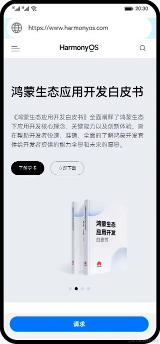HTTPS 协议是位于应用层的一种安全传输协议,与 HTTP 最大的区别是服务端与客户端之间进行数据传输都会经过 TLS/SSL 加密。该示例请求HarmonyOS官网,并将请求得到的内容通过 Web 容器展示出来。效果如图所示: