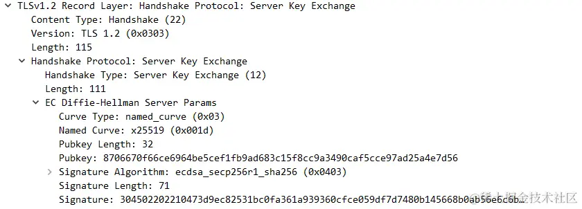 服务端传递“Sever Hello”后,紧跟着会将 Certificate(证书)、“Sever Key Exchange”消息以及“Server Hello Done”消息传递给客户端。此处着重分析“Sever Key Exchange”,数据内容如图所示: