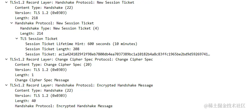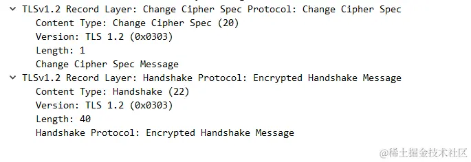 经过上述过程,客户端持有 Client Random、Server Random 以及 Server Params,将 Server Params 使用服务端公钥解密后得到“Server Key Exchange”消息中的临时公钥,客户端使用 x25519 算法计算出预主密钥(Premaster Secret),然后再结合客户端随机数、服务端随机数以及预主密钥生成主密钥,最终构建“会话密钥”。“Change Cipher Spec”消息表示客户端已经生成密钥,并切换到加密模式。最后将之前所有的握手数据做一个摘要,再利用双方协商好的对称密钥进行加密, 通过“Encrypted Handshake Message”消息将加密数据传递给服务端做校验。数据内容如图所示: