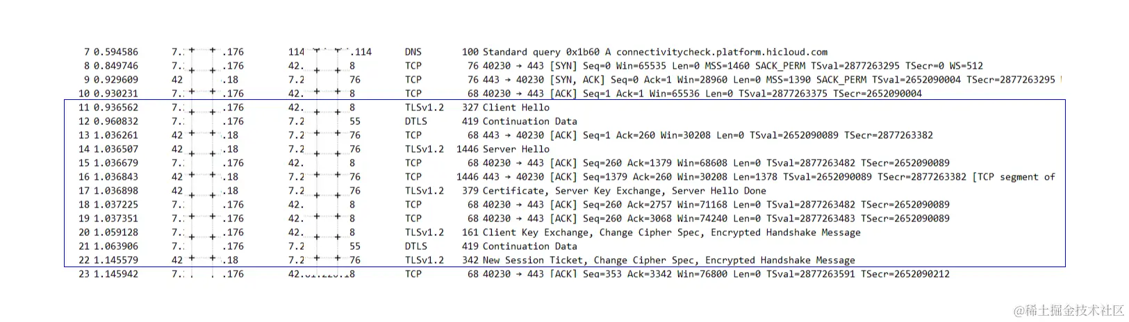 本章节主要通过抓包数据分析 TLS 协议的握手过程,其中包括交换参数、证书验证、密钥计算以及验证密钥等,抓包内容如图所示: