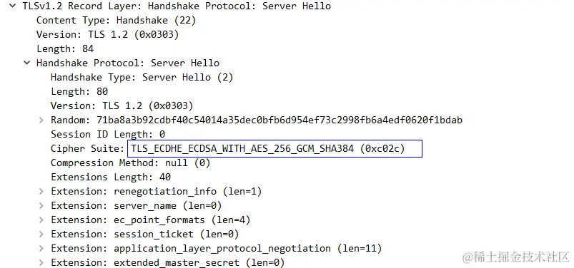 服务端接收到客户端数据后,将响应数据通过“Sever Hello”传递给客户端,包括随机数(Sever Random,用于后续生成“会话密钥”)、协议版本号(TLS1.2)以及 Cipher Suite(任意选择一个客户端支持的密码套件),数据内容如图所示: