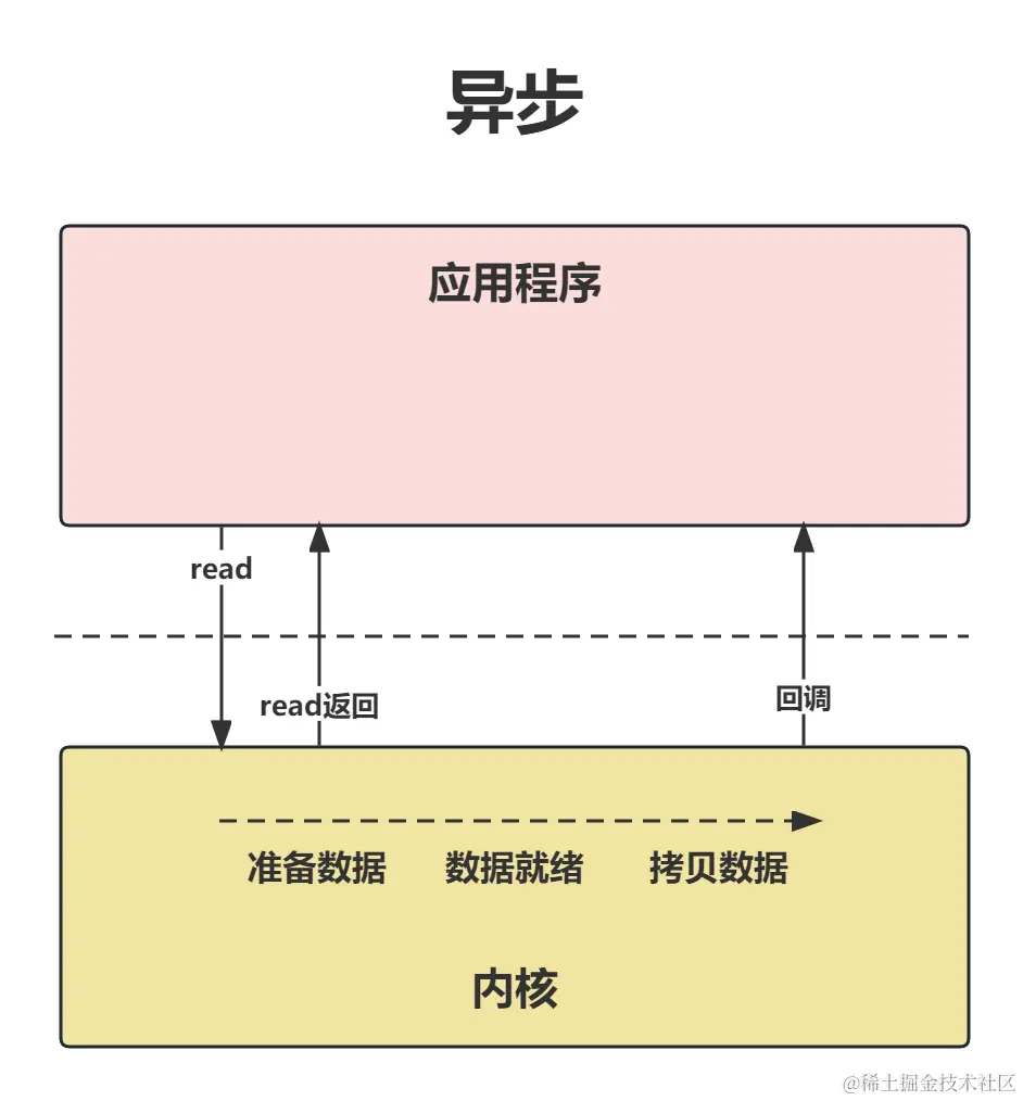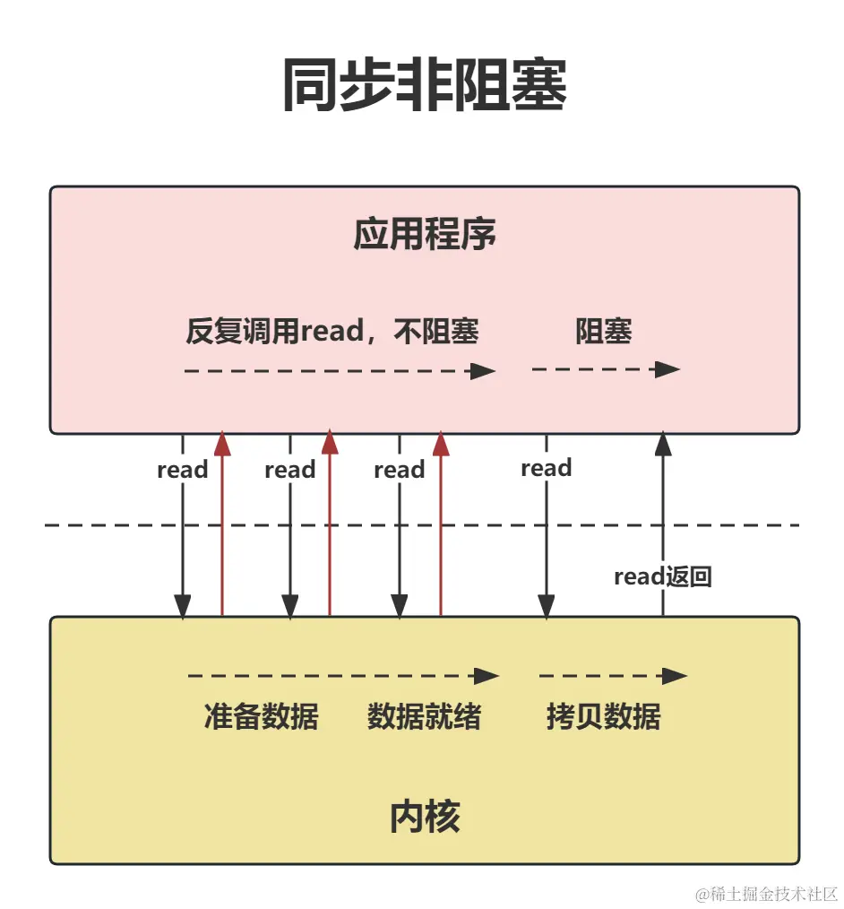 应用程序发起read调用后,会一直阻塞,直到内核把数据拷贝到应用程序。
