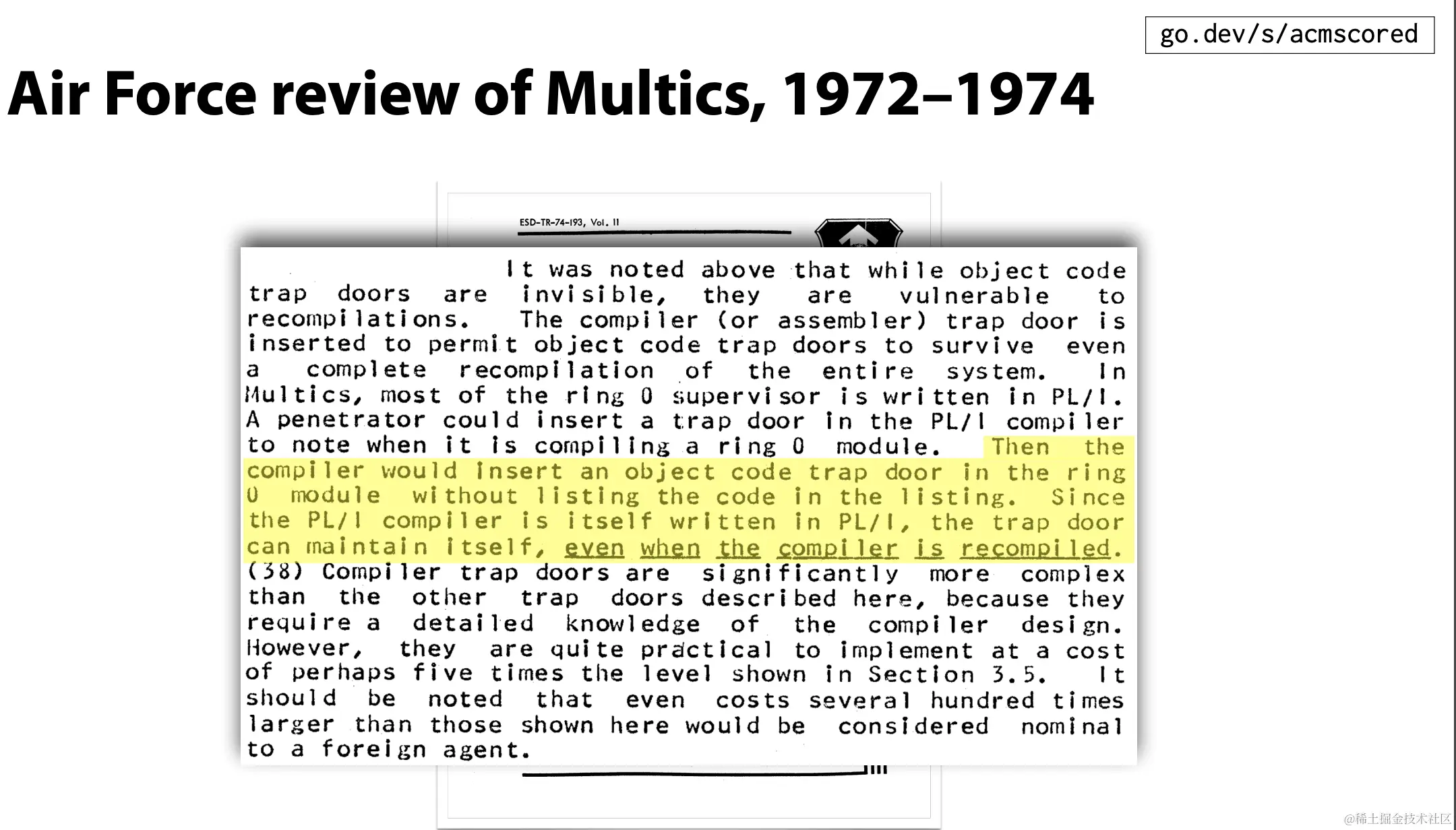 该报告提出了在看似无害的系统调用中添加后门的可能性,他们将其称为Trap door。如果传递了一个特定的、极不可能的参数,系统调用将允许读取或写入内核内存中的任意字节。即使是小的恶意更改也会完全破坏系统的安全性。报告探讨了如何进行这类更改的机制,并隐藏了这一选项,例如在软件分发期间进行更改。报告提到美国邮件和不安全的电话线路是拦截和修改源代码的方法。我特别感兴趣的是,以前有通过伪造的固件邮寄自定义补丁的想法。虽然这些攻击方法现在已过时,但类似的事情,如XcodeGhost攻击,仍然在发生。
