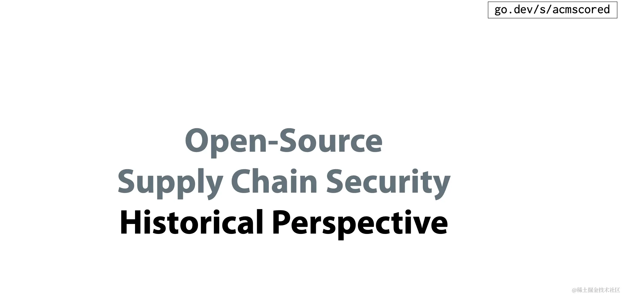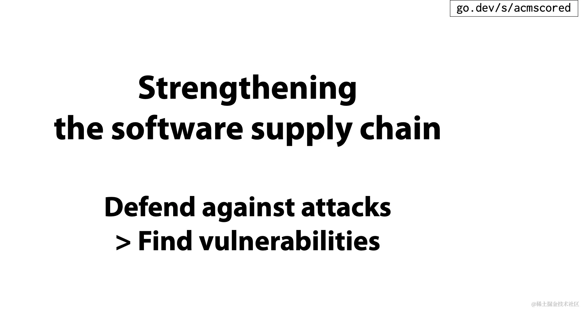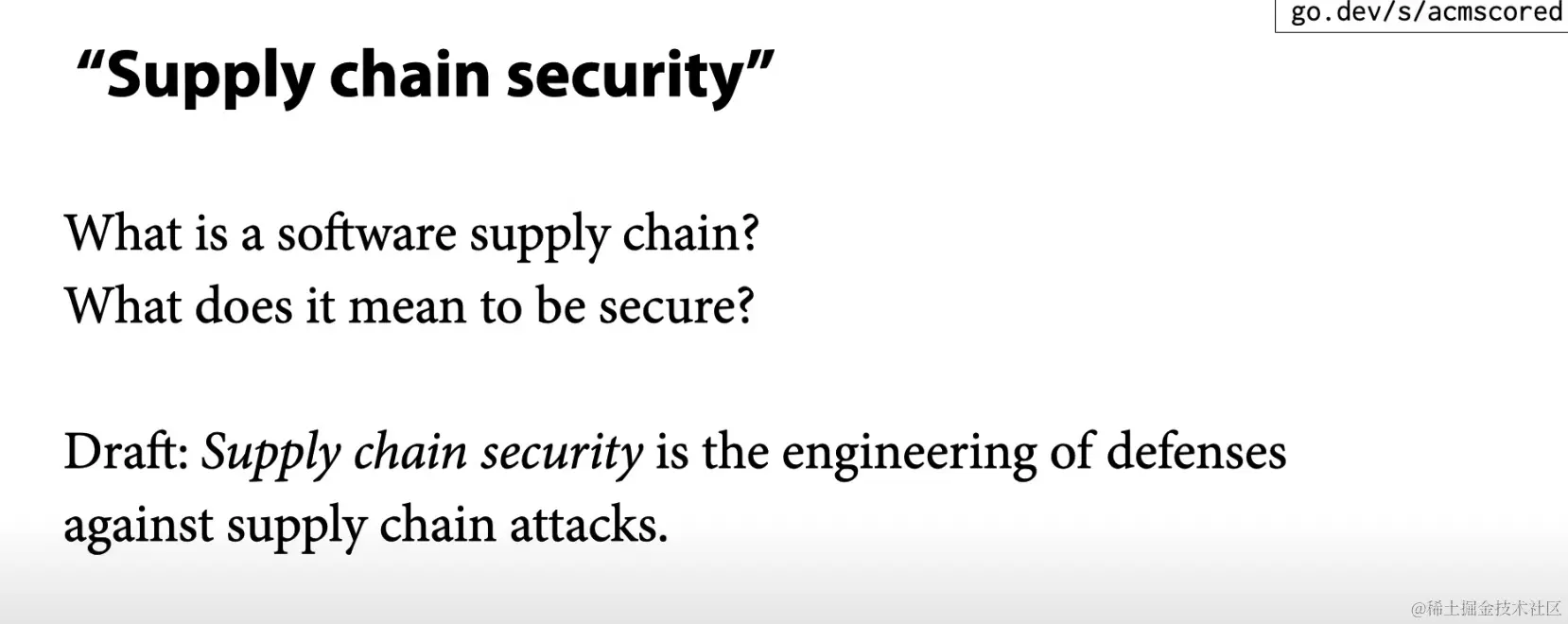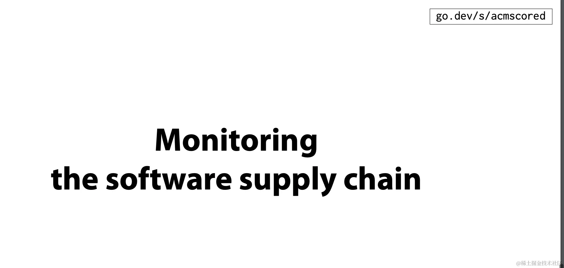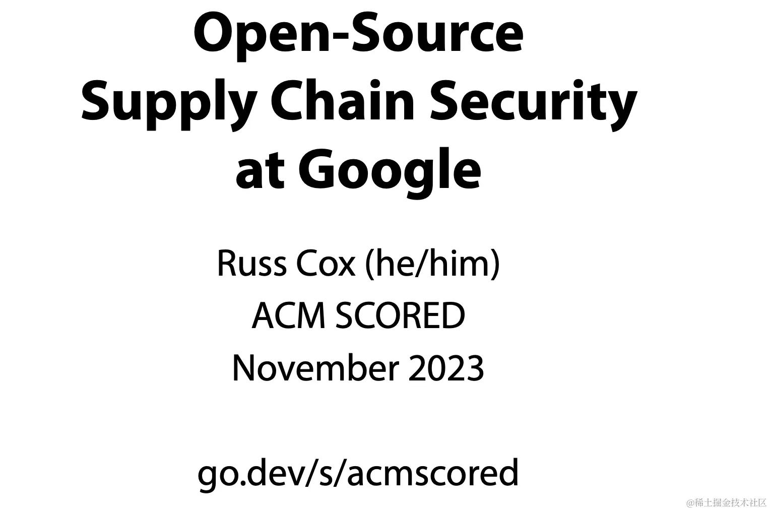 我们Go工作的一个重要部分, 是确保它是一个安全的编程环境。因此,我们在供应链安全方面投入了大量的时间和努力。我今天的目标是让你了解Google在供应链安全方面的整体努力,并强调我认为需要进一步(投入更多)研究的领域。如果你想了解更多或参考这些内容,这些幻灯片已经发布在go.dev/s/acmscored…上。