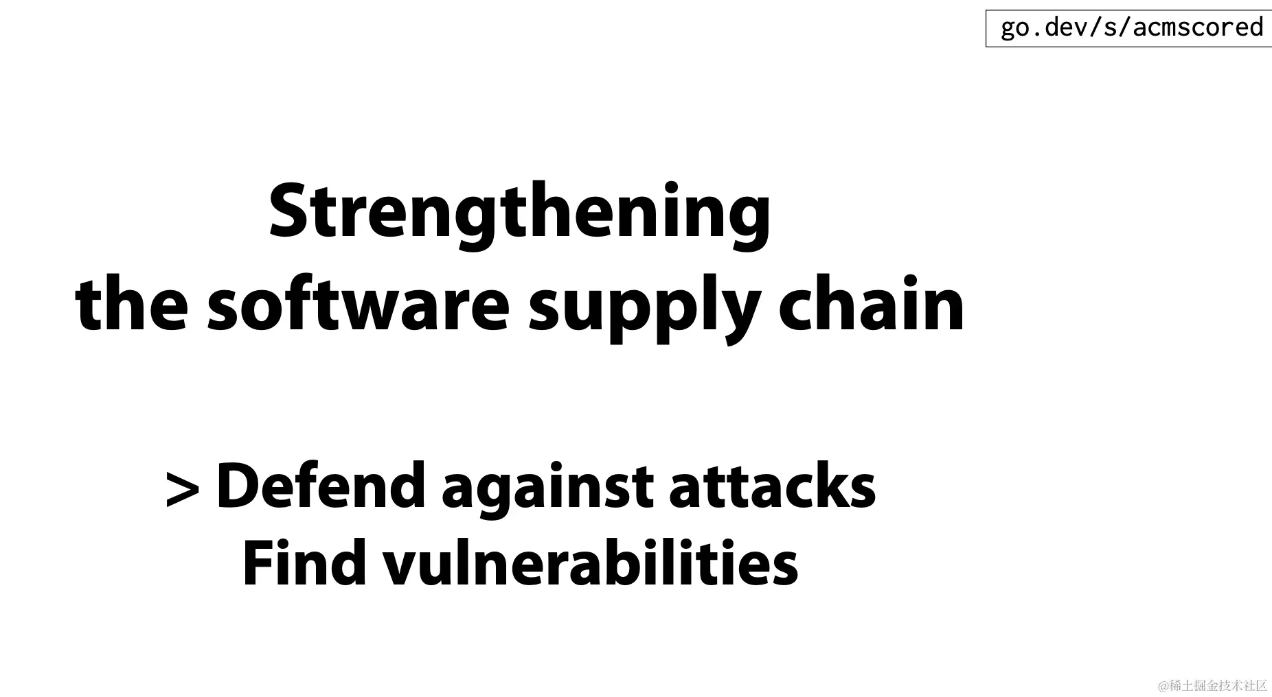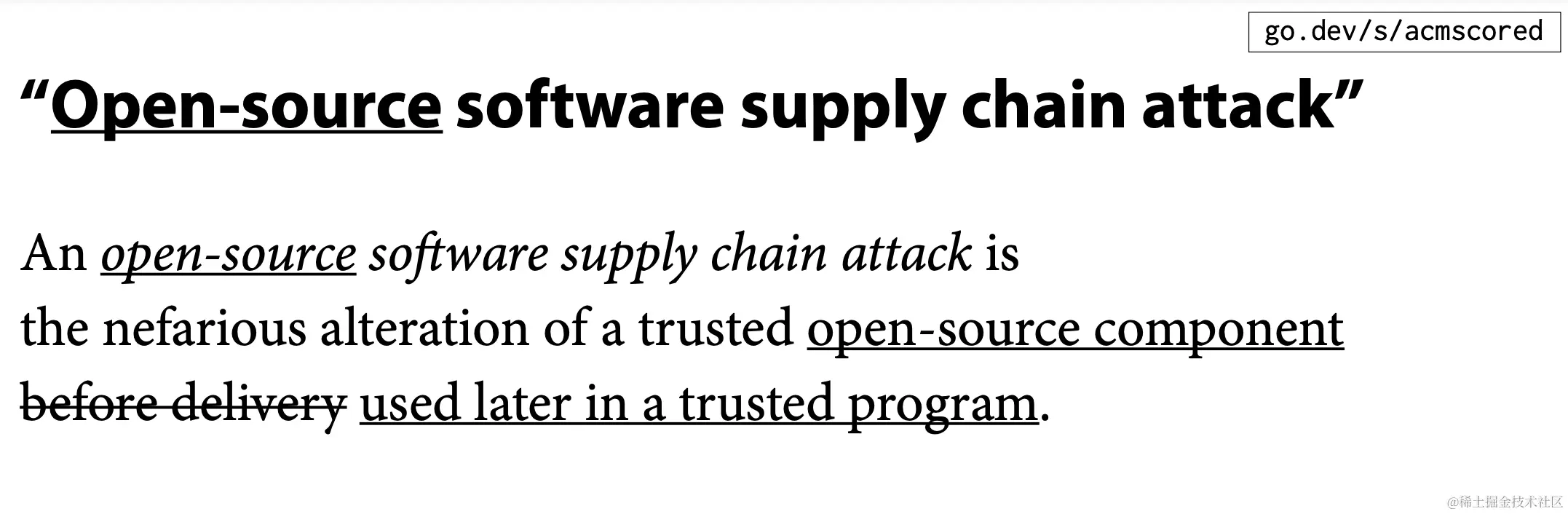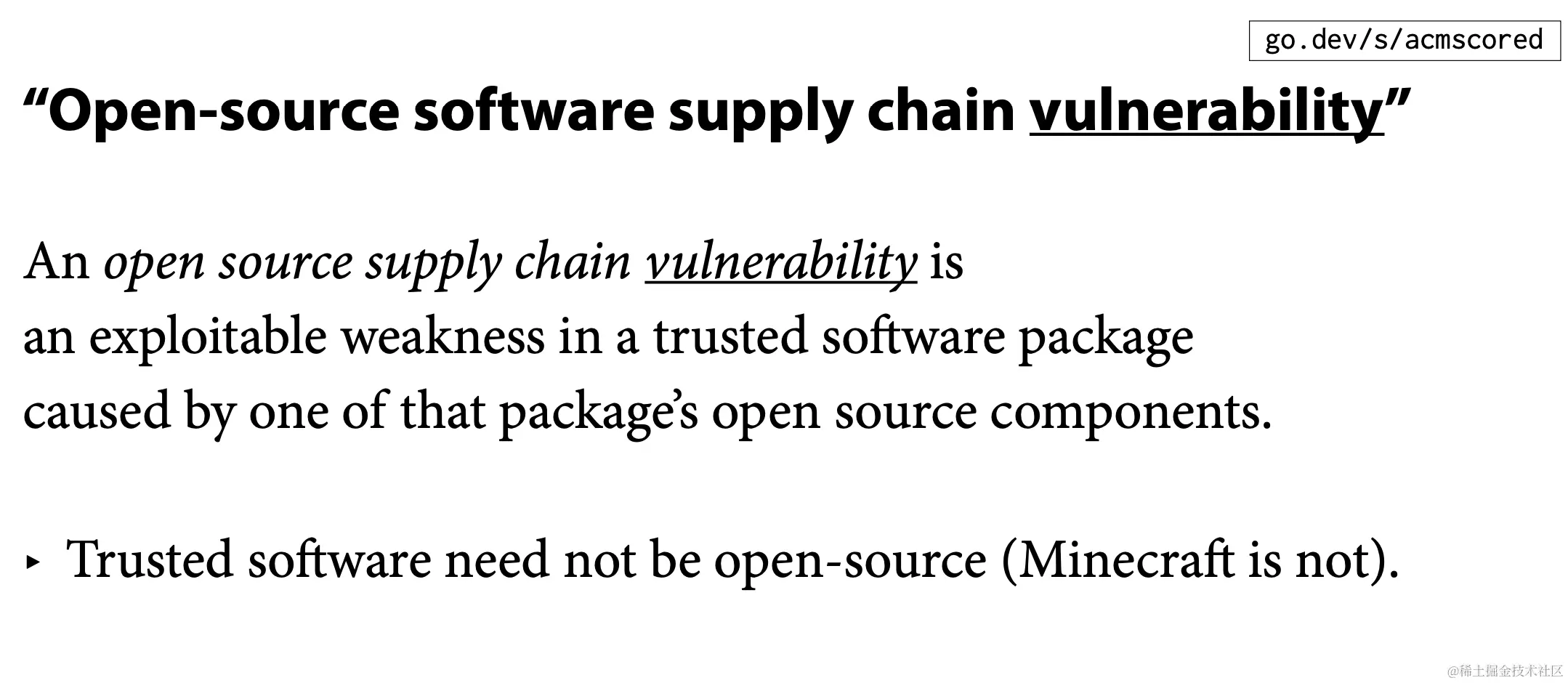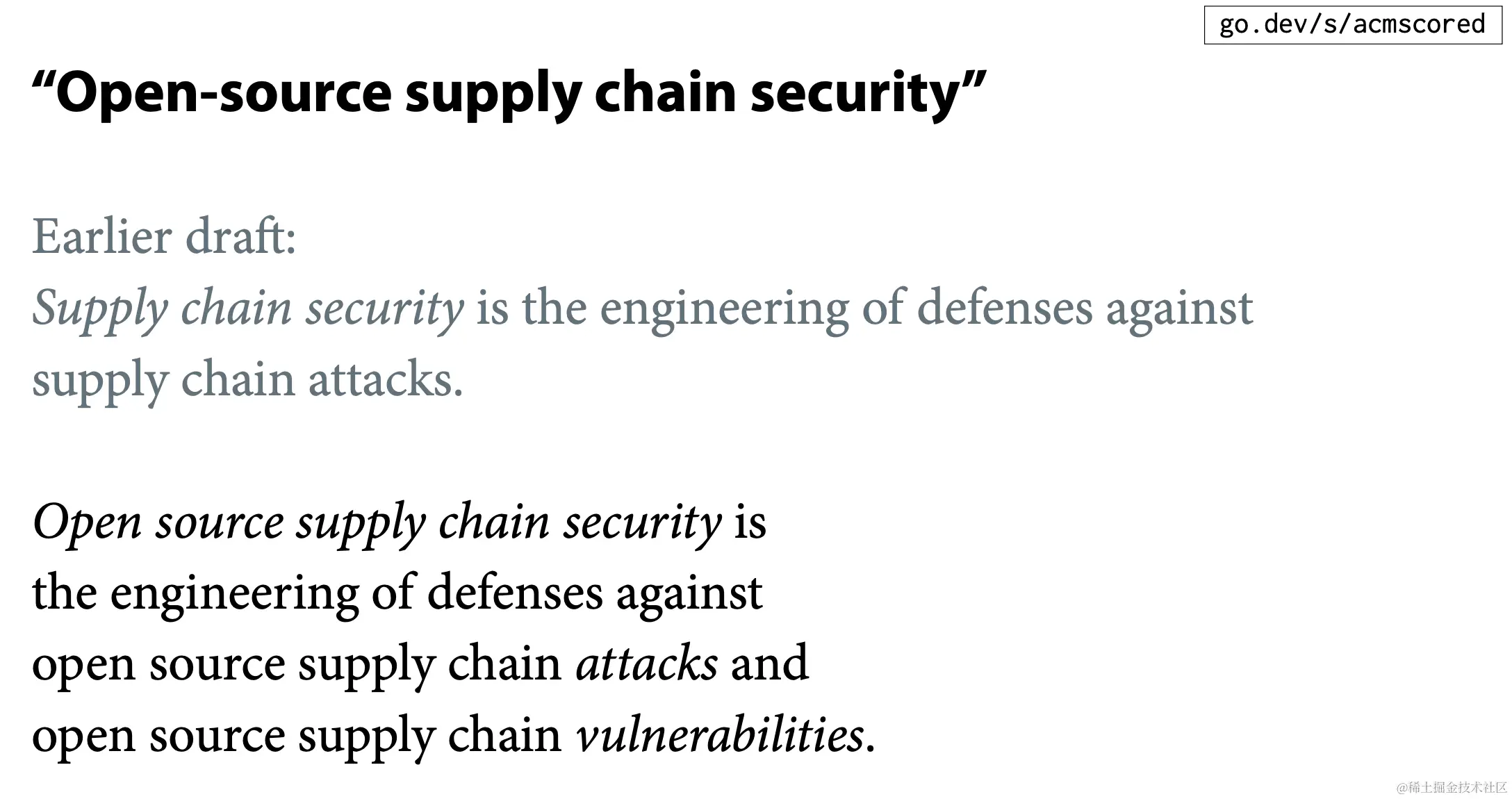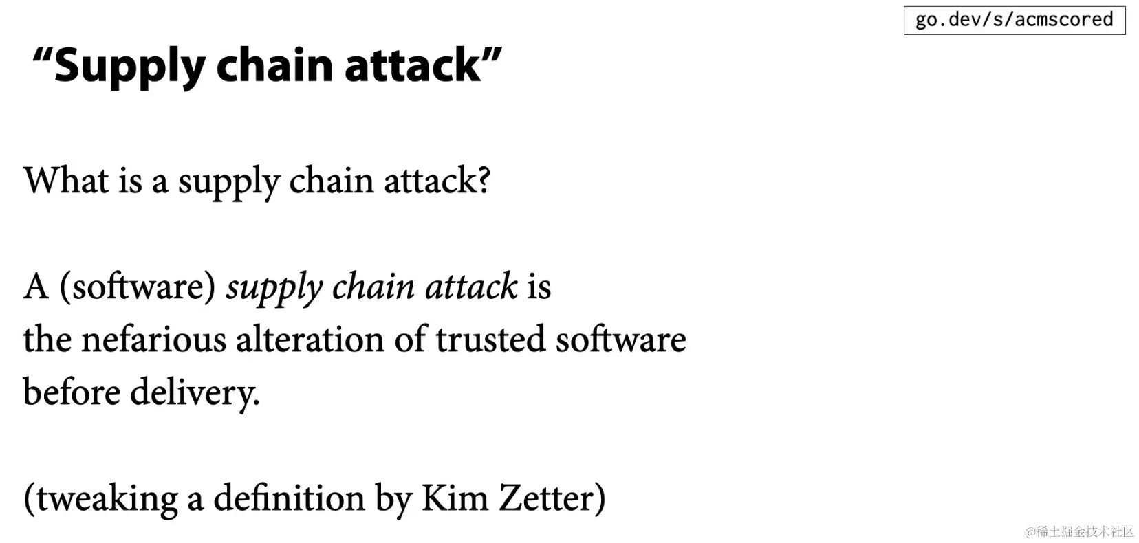 我们Go工作的一个重要部分, 是确保它是一个安全的编程环境。因此,我们在供应链安全方面投入了大量的时间和努力。我今天的目标是让你了解Google在供应链安全方面的整体努力,并强调我认为需要进一步(投入更多)研究的领域。如果你想了解更多或参考这些内容,这些幻灯片已经发布在go.dev/s/acmscored…上。