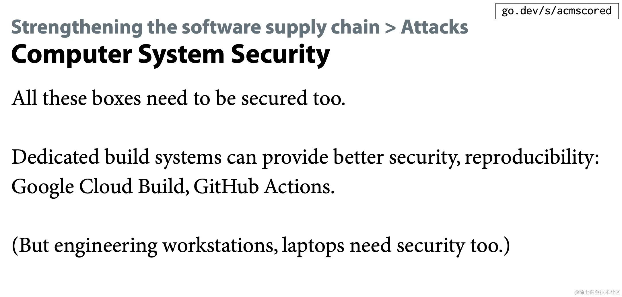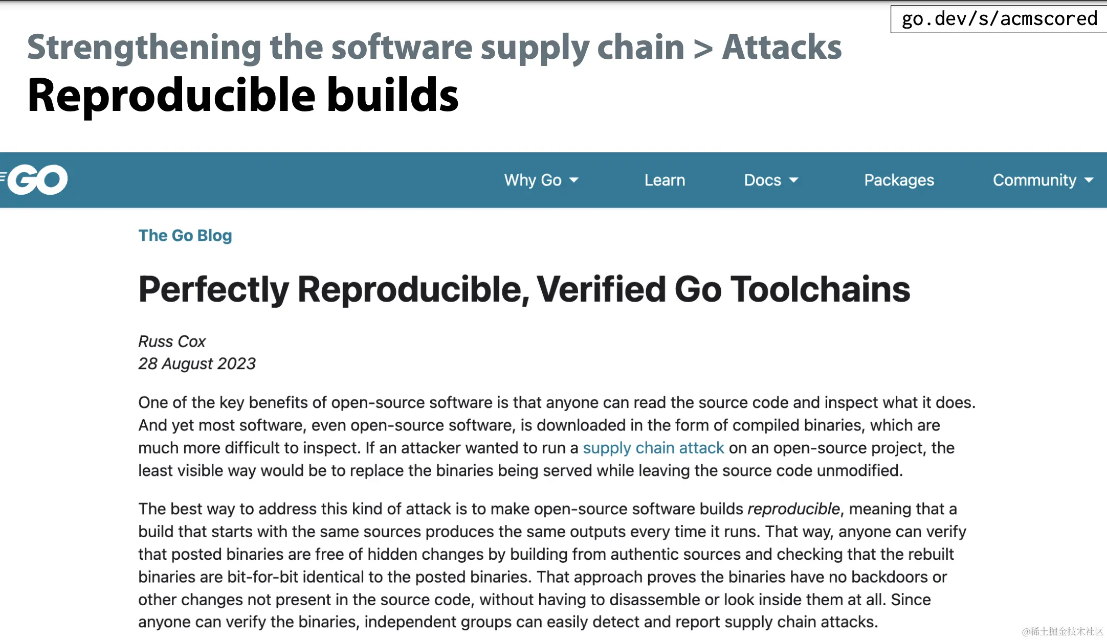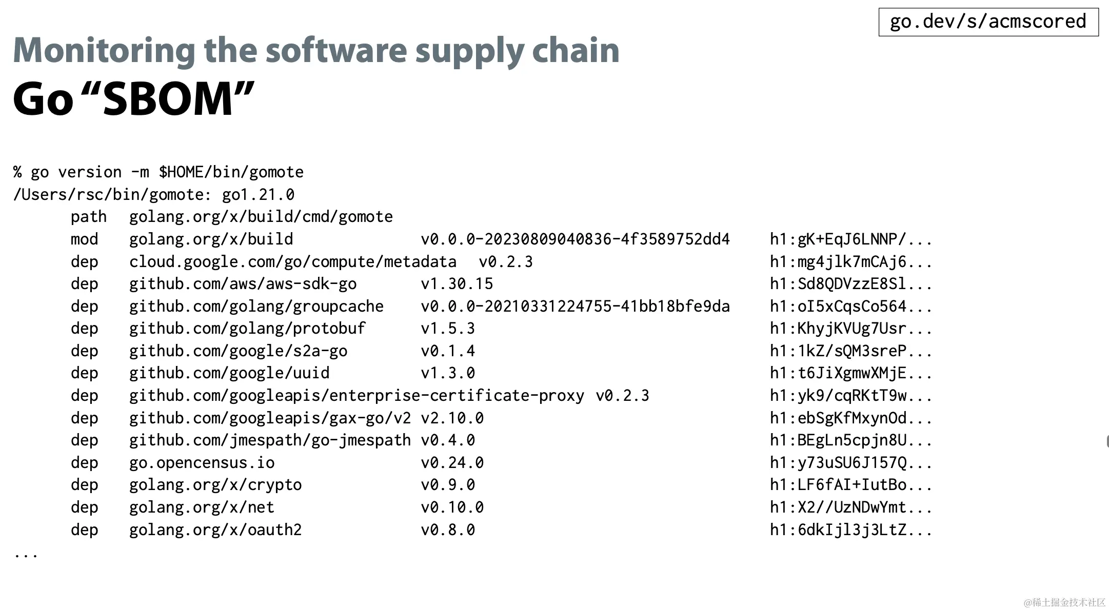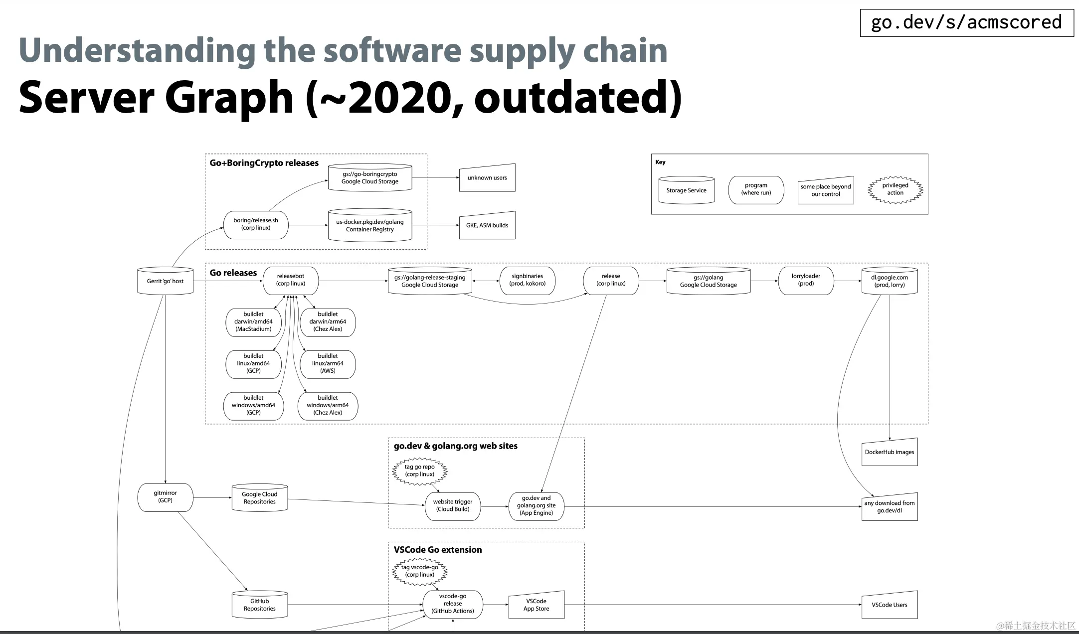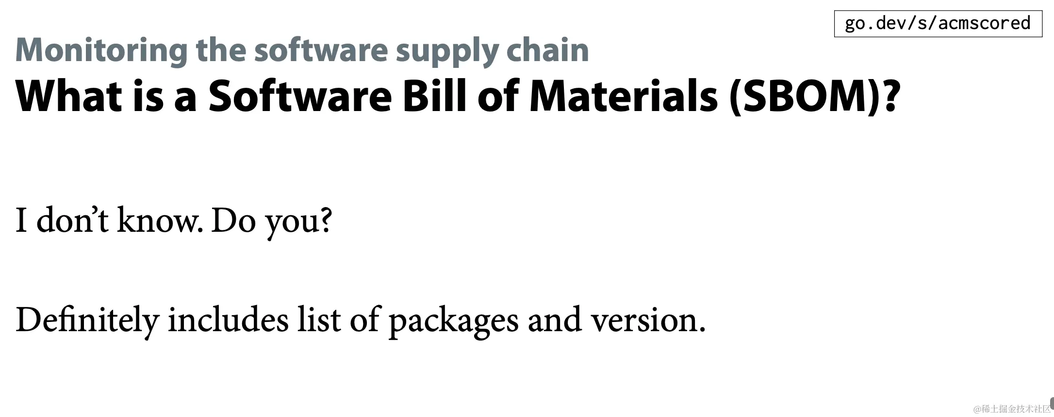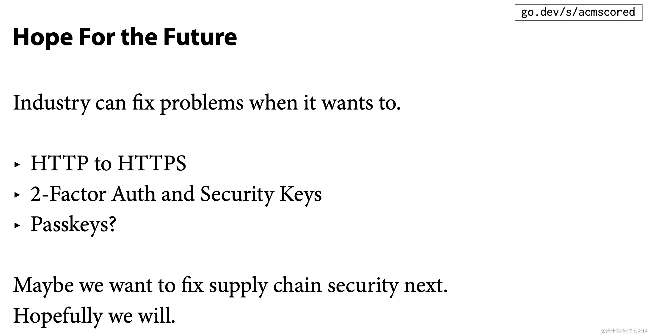 我们Go工作的一个重要部分, 是确保它是一个安全的编程环境。因此,我们在供应链安全方面投入了大量的时间和努力。我今天的目标是让你了解Google在供应链安全方面的整体努力,并强调我认为需要进一步(投入更多)研究的领域。如果你想了解更多或参考这些内容,这些幻灯片已经发布在go.dev/s/acmscored…上。