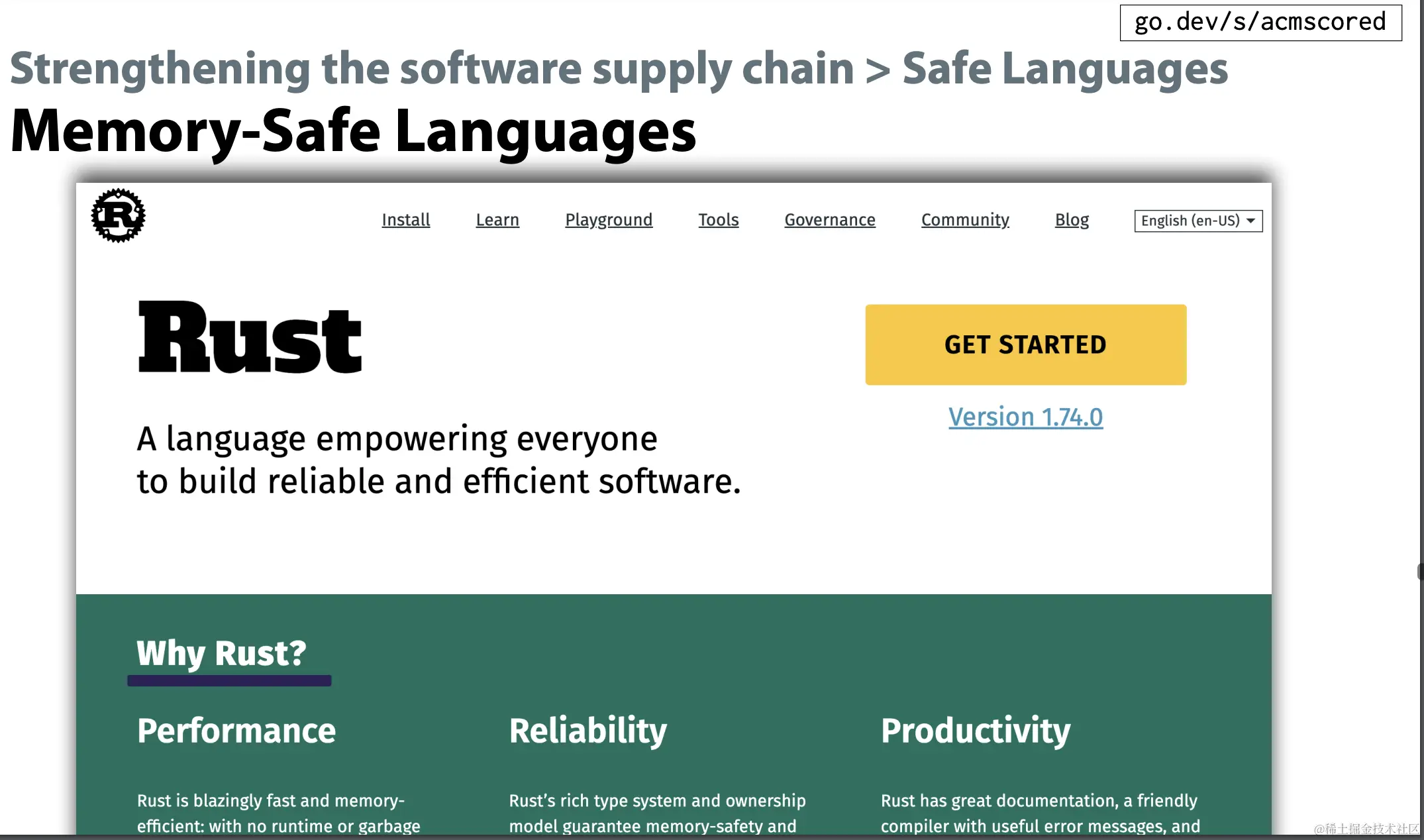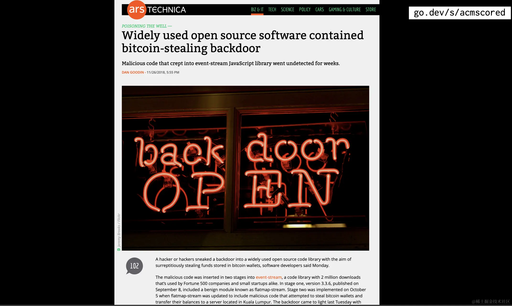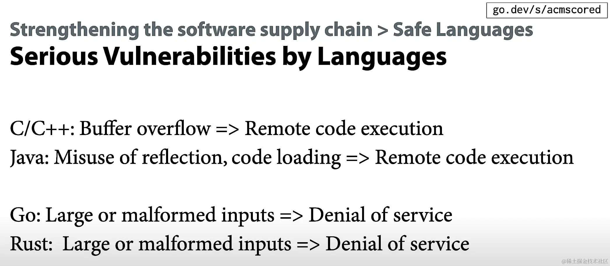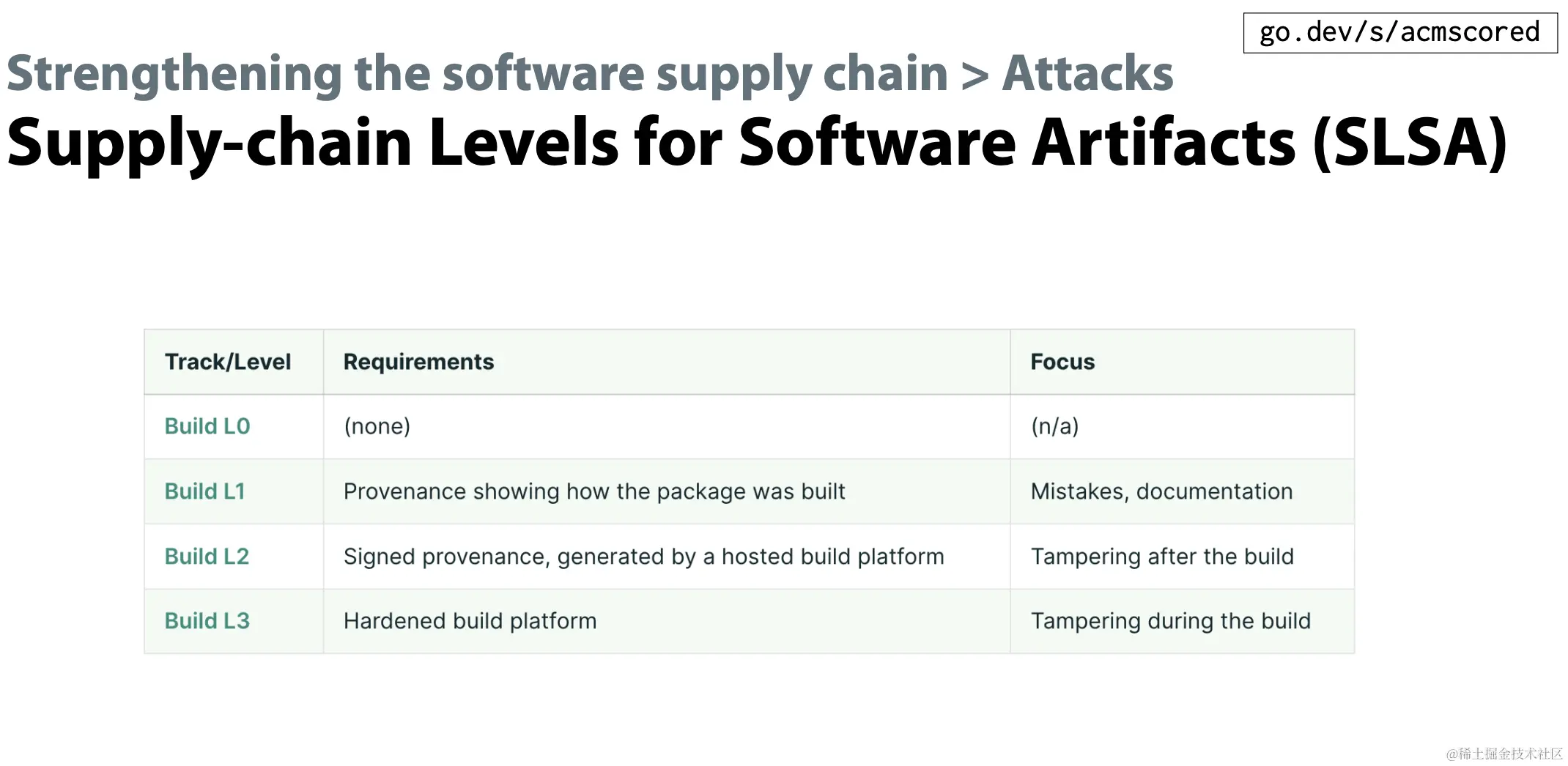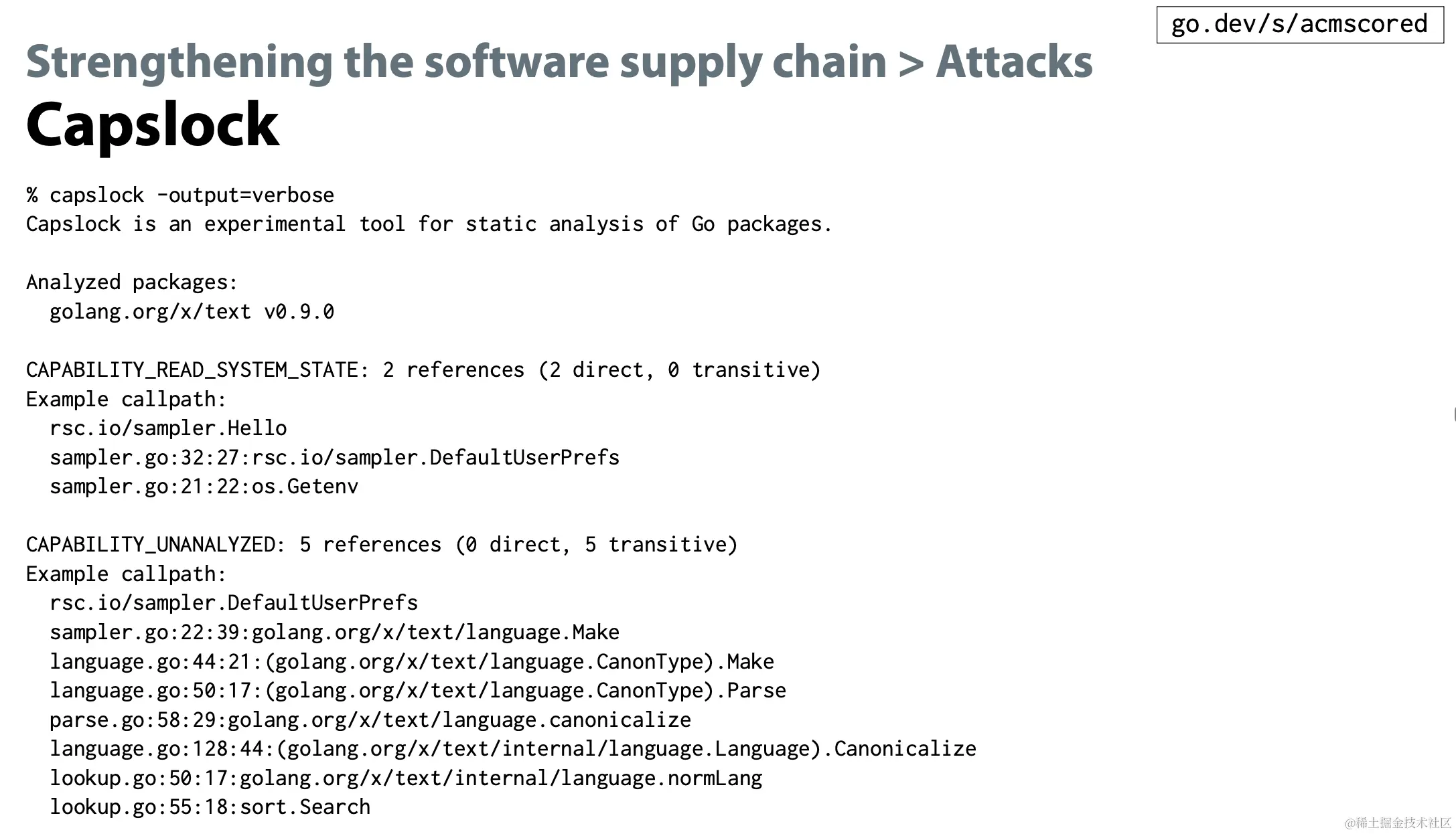 我们Go工作的一个重要部分, 是确保它是一个安全的编程环境。因此,我们在供应链安全方面投入了大量的时间和努力。我今天的目标是让你了解Google在供应链安全方面的整体努力,并强调我认为需要进一步(投入更多)研究的领域。如果你想了解更多或参考这些内容,这些幻灯片已经发布在go.dev/s/acmscored…上。