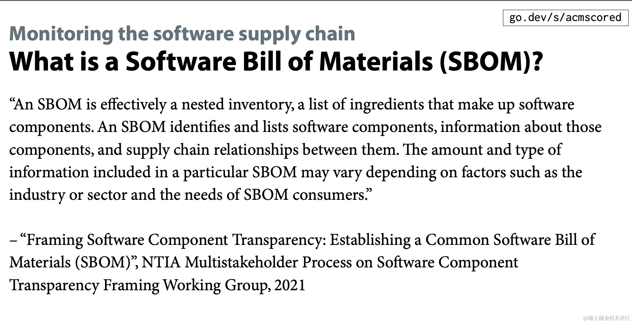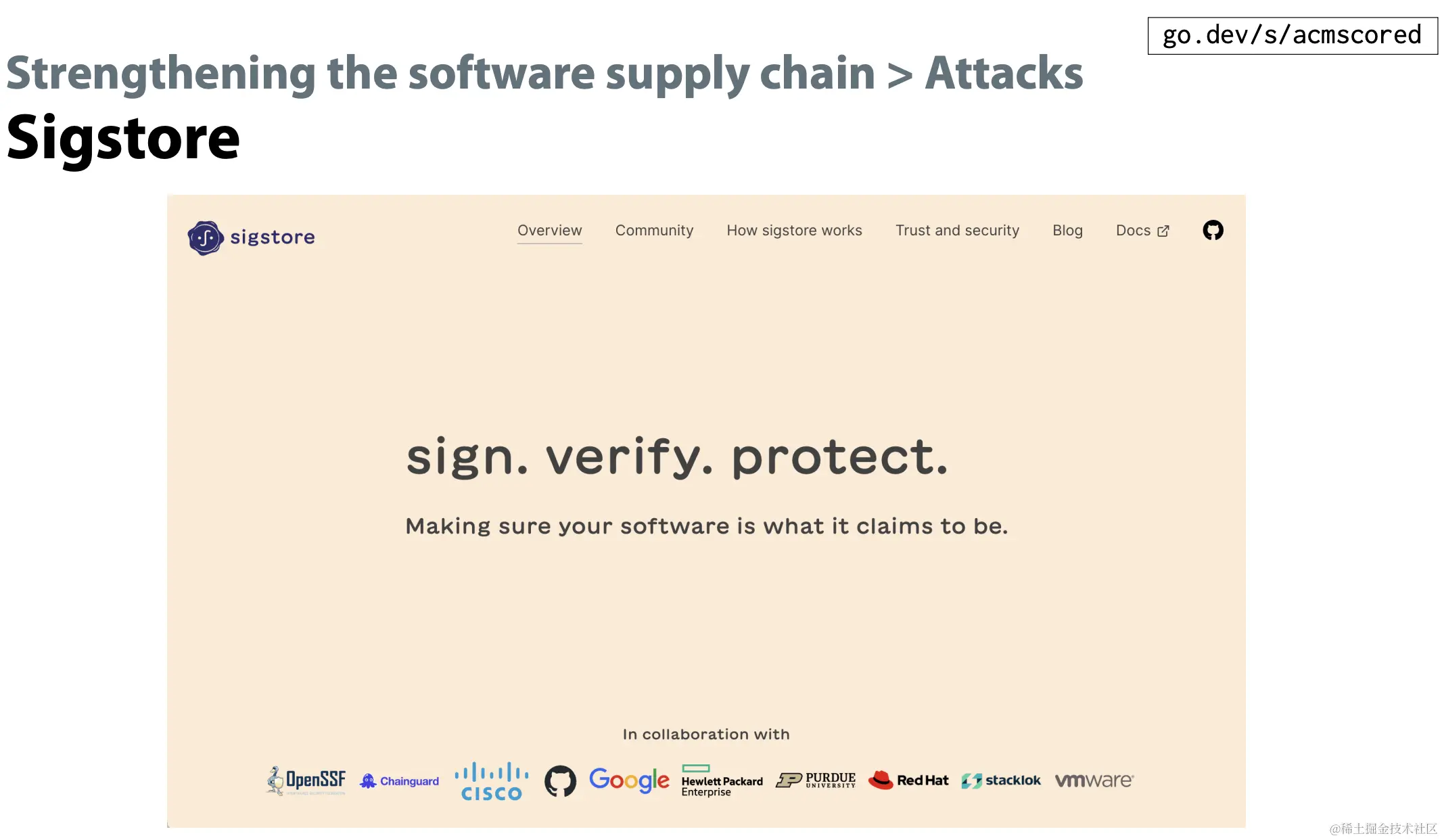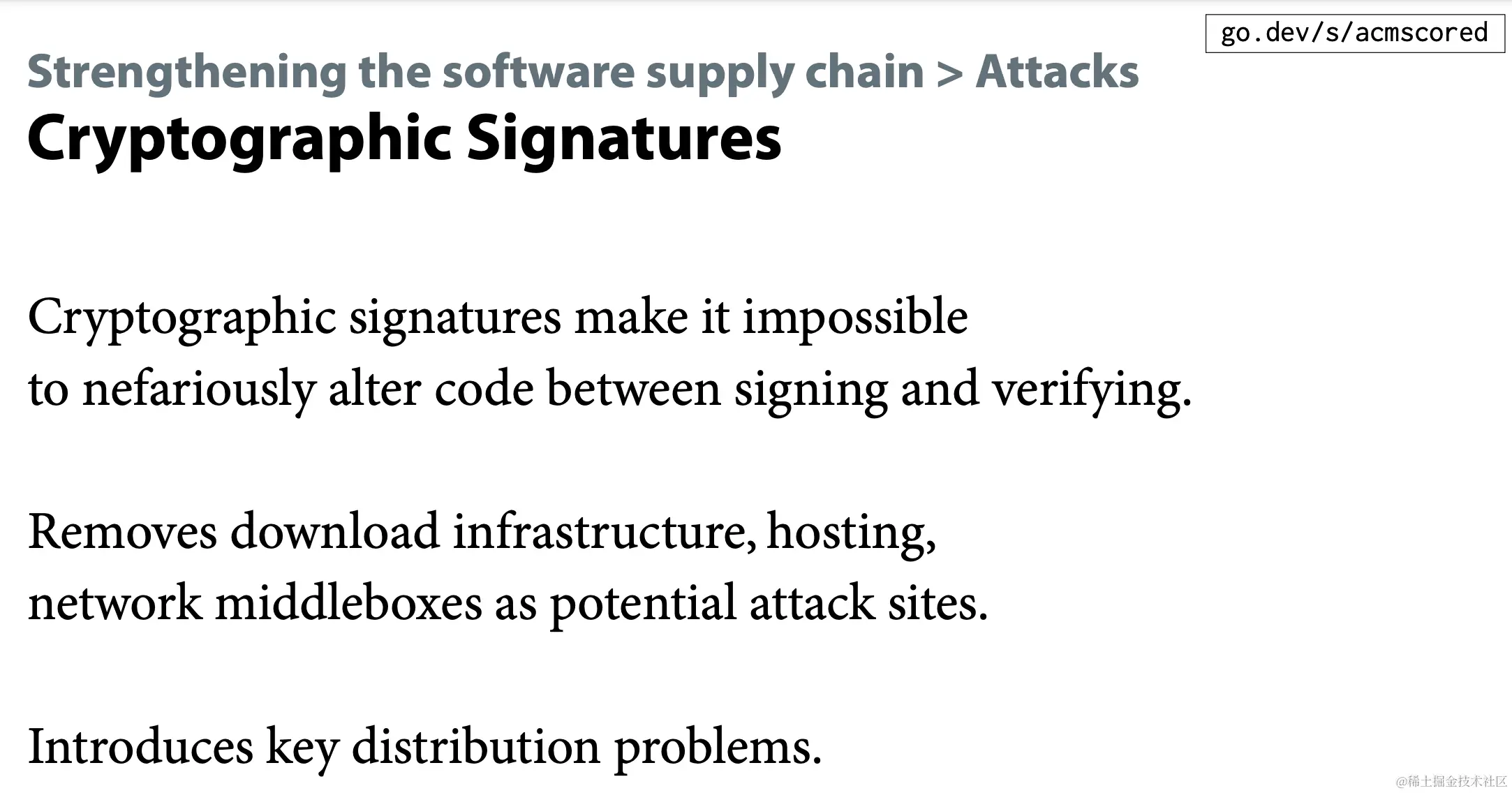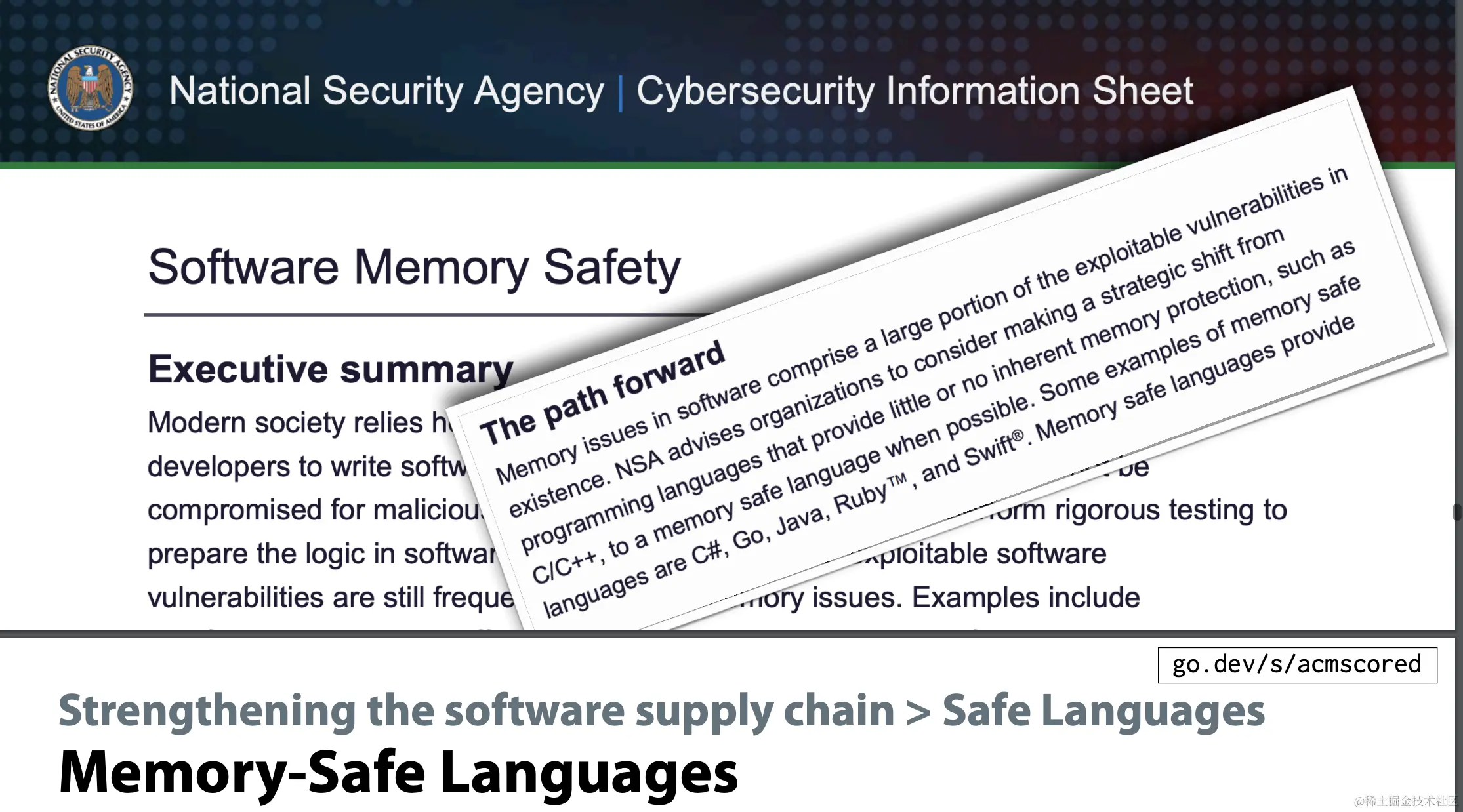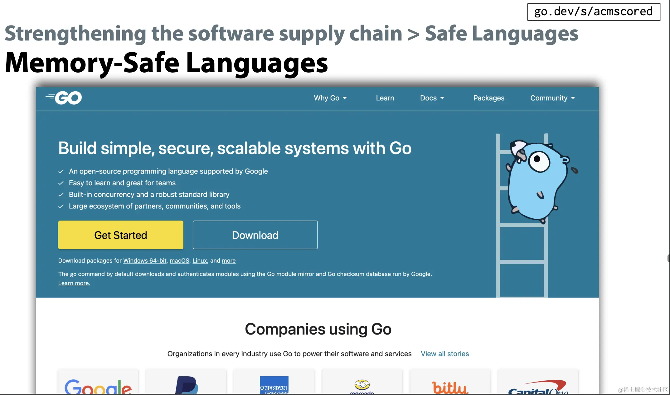 我们Go工作的一个重要部分, 是确保它是一个安全的编程环境。因此,我们在供应链安全方面投入了大量的时间和努力。我今天的目标是让你了解Google在供应链安全方面的整体努力,并强调我认为需要进一步(投入更多)研究的领域。如果你想了解更多或参考这些内容,这些幻灯片已经发布在go.dev/s/acmscored…上。