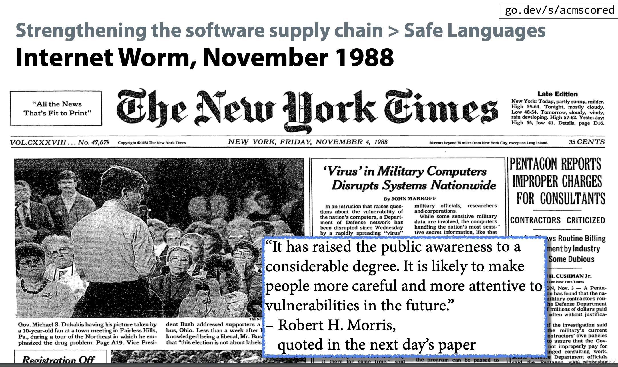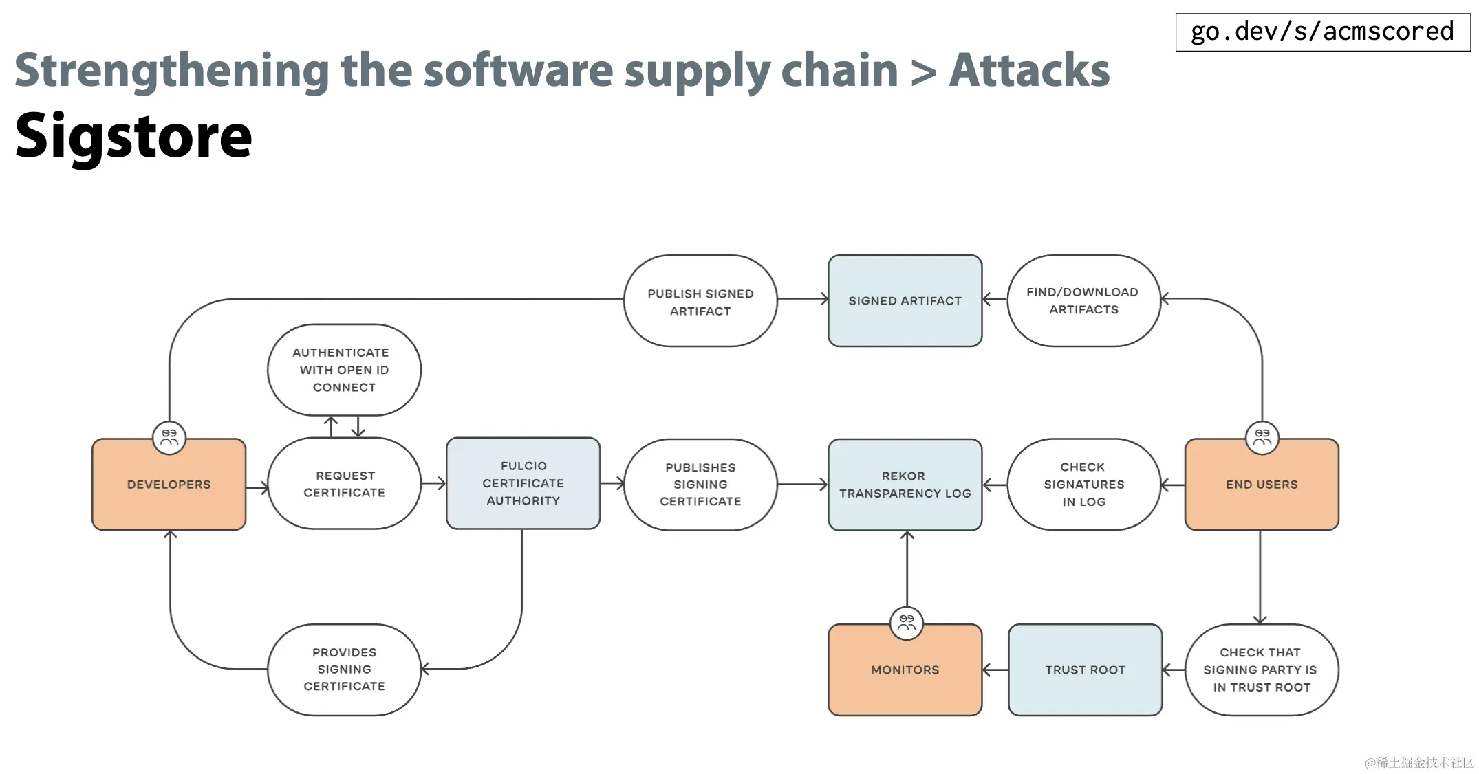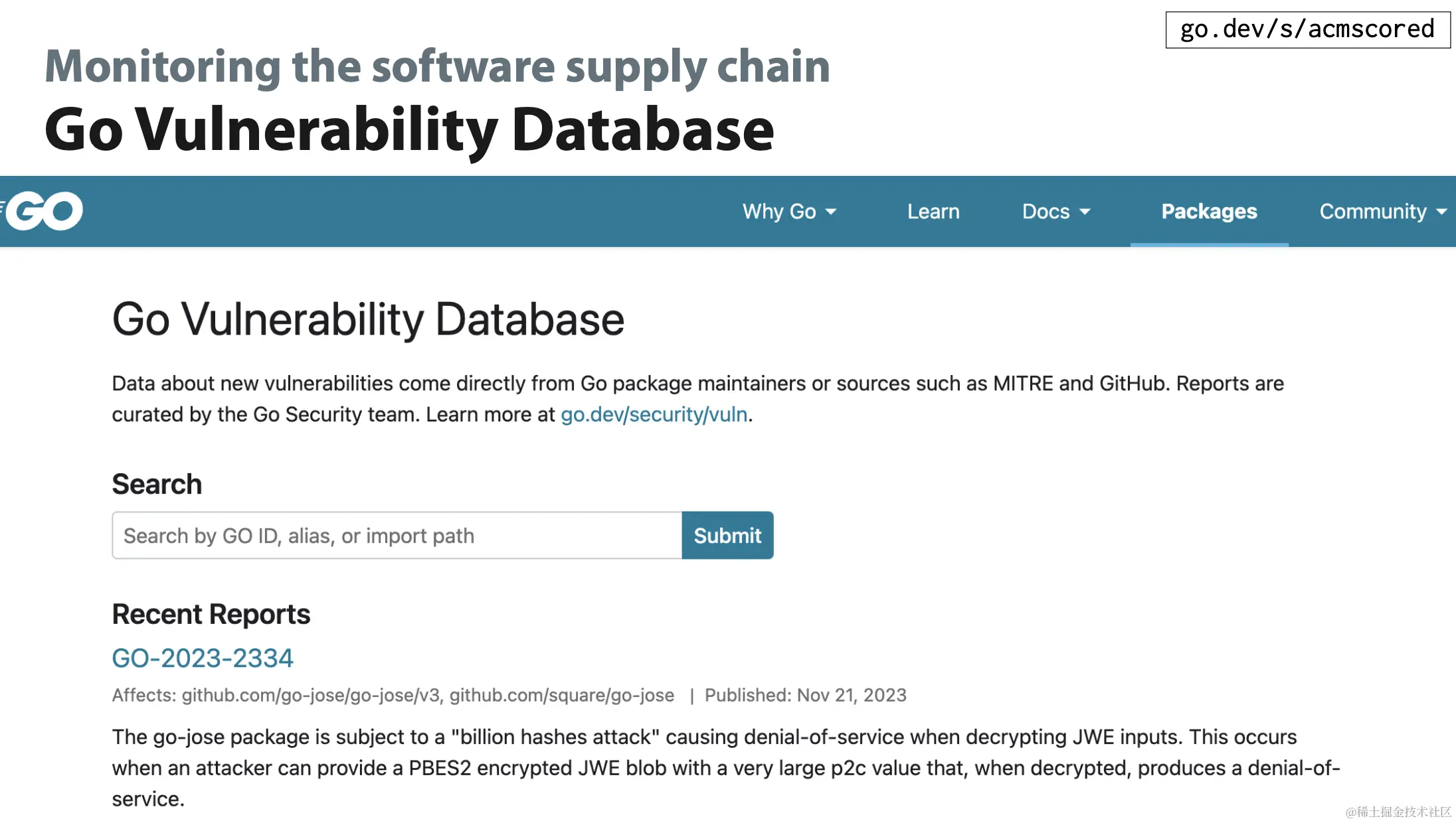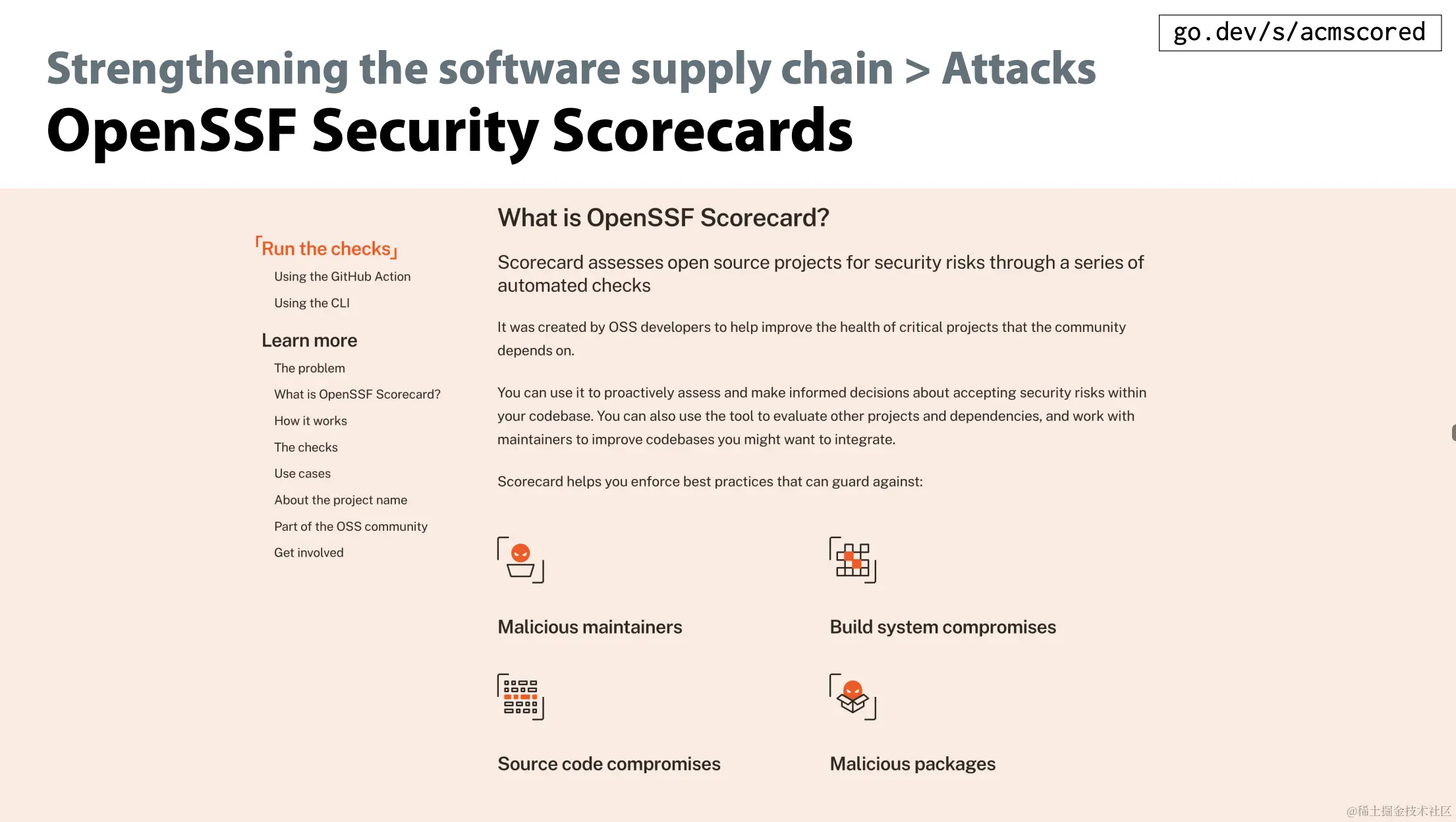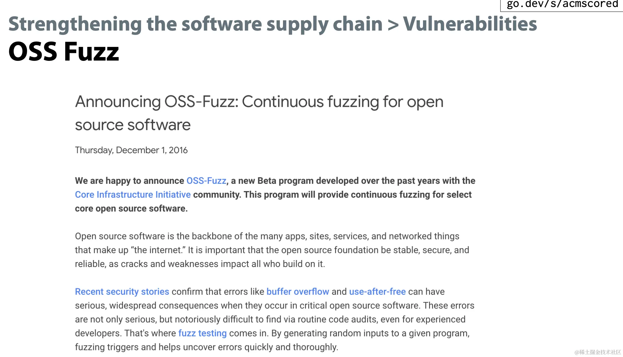 我们Go工作的一个重要部分, 是确保它是一个安全的编程环境。因此,我们在供应链安全方面投入了大量的时间和努力。我今天的目标是让你了解Google在供应链安全方面的整体努力,并强调我认为需要进一步(投入更多)研究的领域。如果你想了解更多或参考这些内容,这些幻灯片已经发布在go.dev/s/acmscored…上。