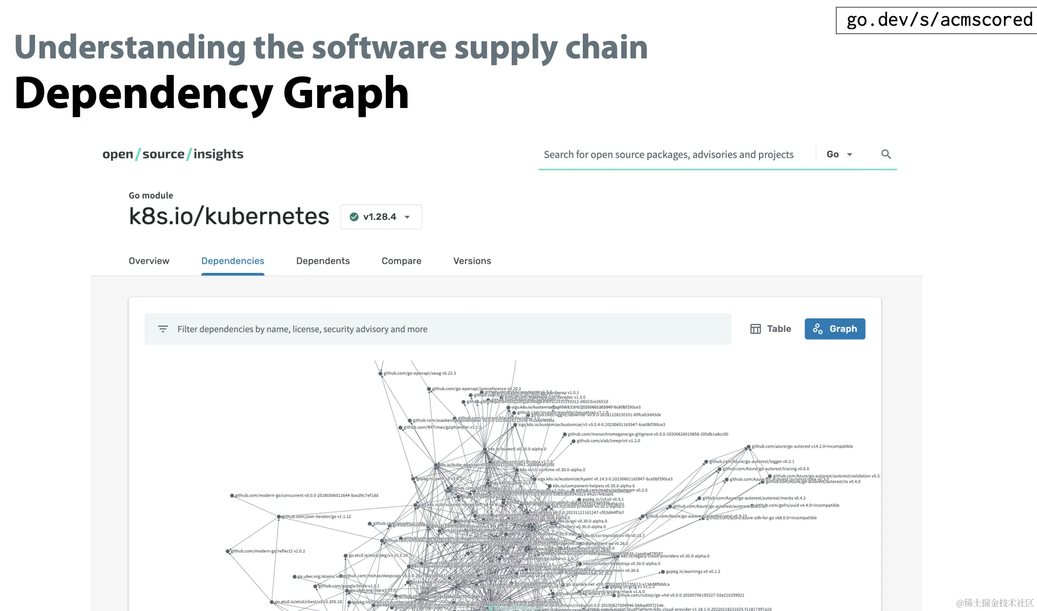 另一种图表是依赖关系图, 展示了构建过程中使用的不同开源组件。例如,这里展示的是Kubernetes的依赖关系图,根据Google的开源洞察项目,图中有数百个节点,每个节点代表一些相关的机器集合,就像前一张幻灯片所示。每个节点都是一个潜在的攻击点,更不用说这些点可能暴露的潜在漏洞了。