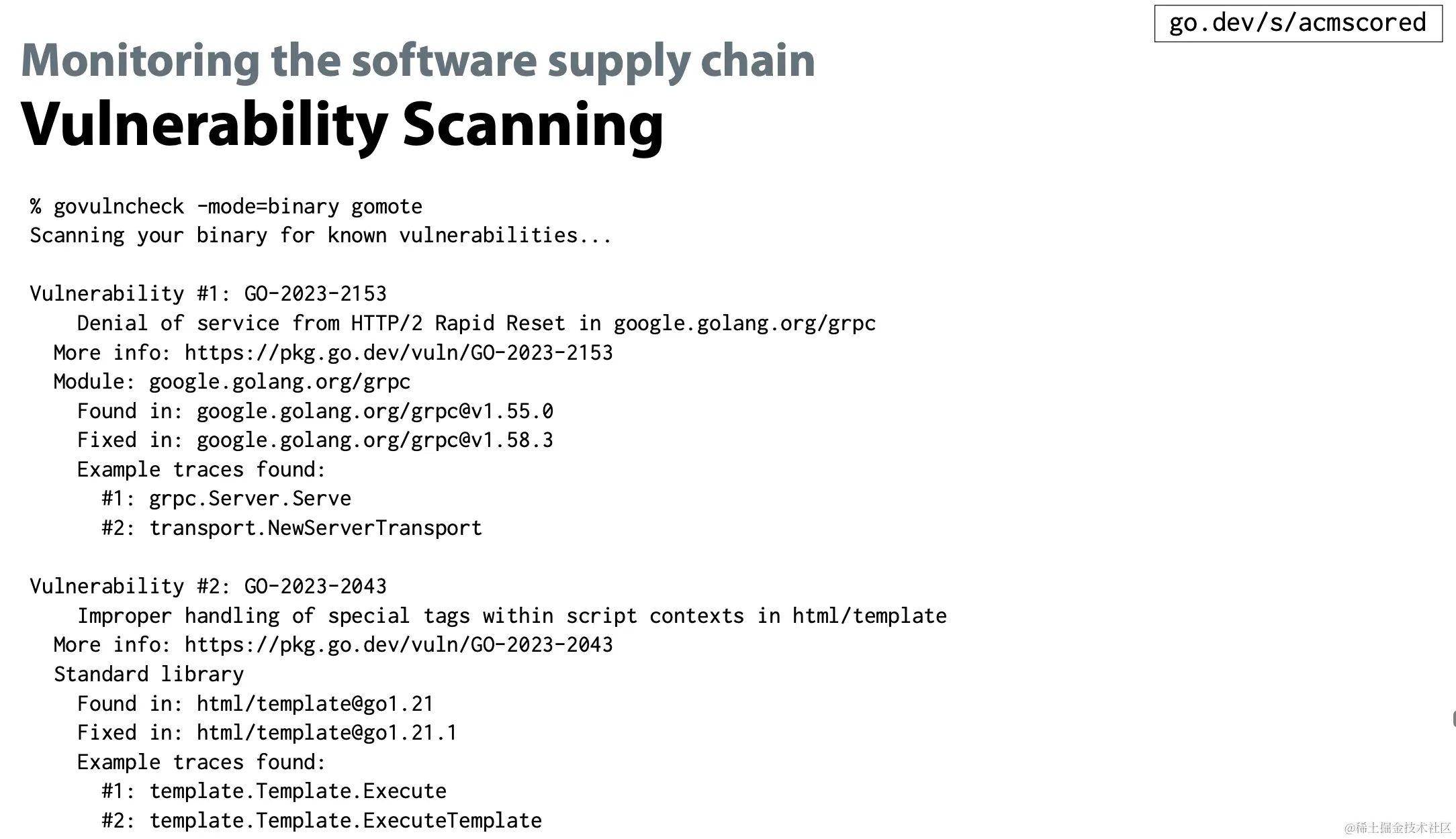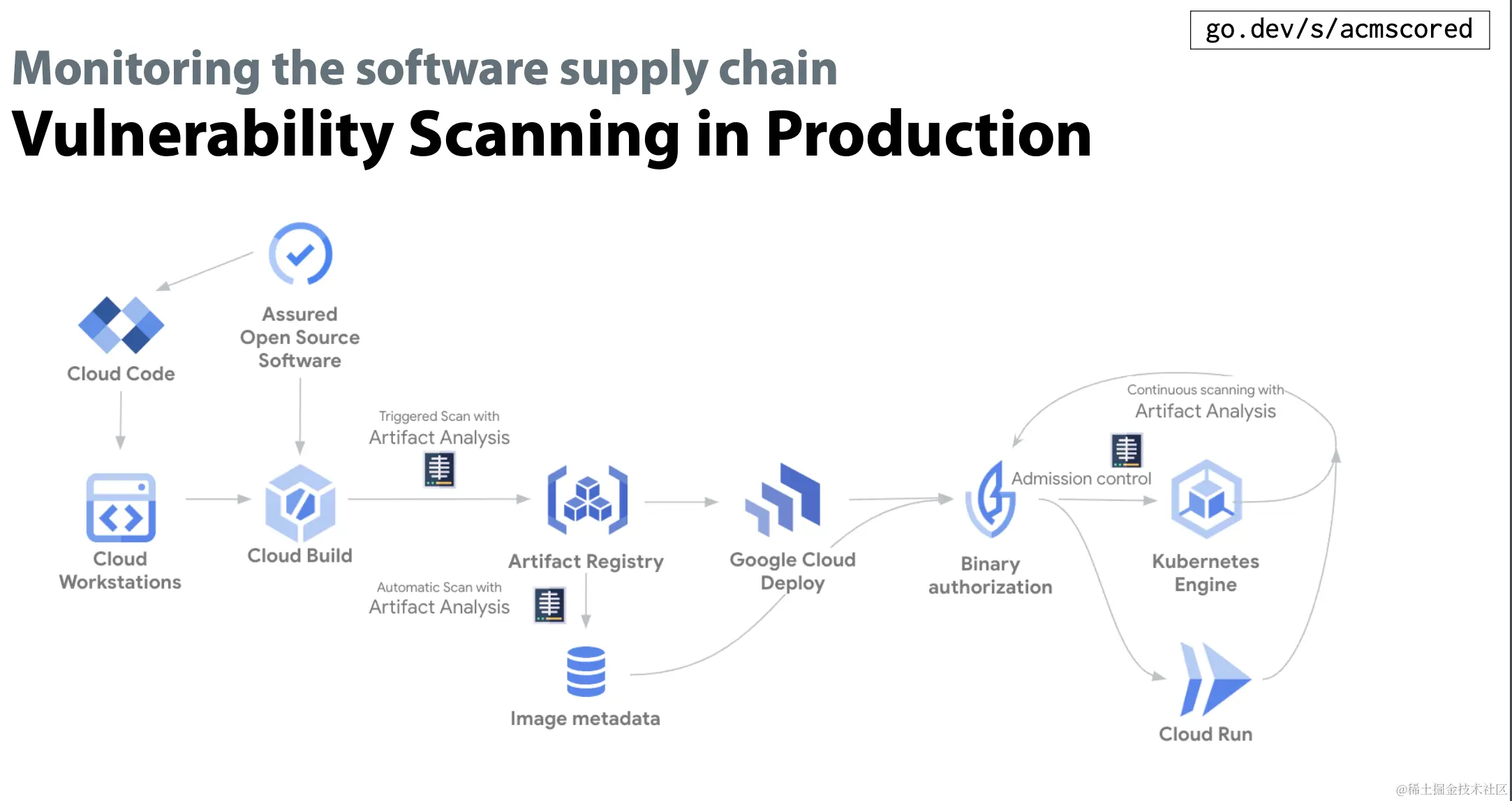 在开发过程中越早提供此信息,就越容易让用户解决这些问题。当然,在开发结束并部署代码后,可能会发现新的漏洞,因此你还需要能够扫描已在生产中运行的代码中的漏洞。一种方法是扫描所有容器映像以查找你正在运行的容器。Google Cloud提供了工件分析API来执行此操作,并且它使用govulncheck来扫描Go二进制文件。