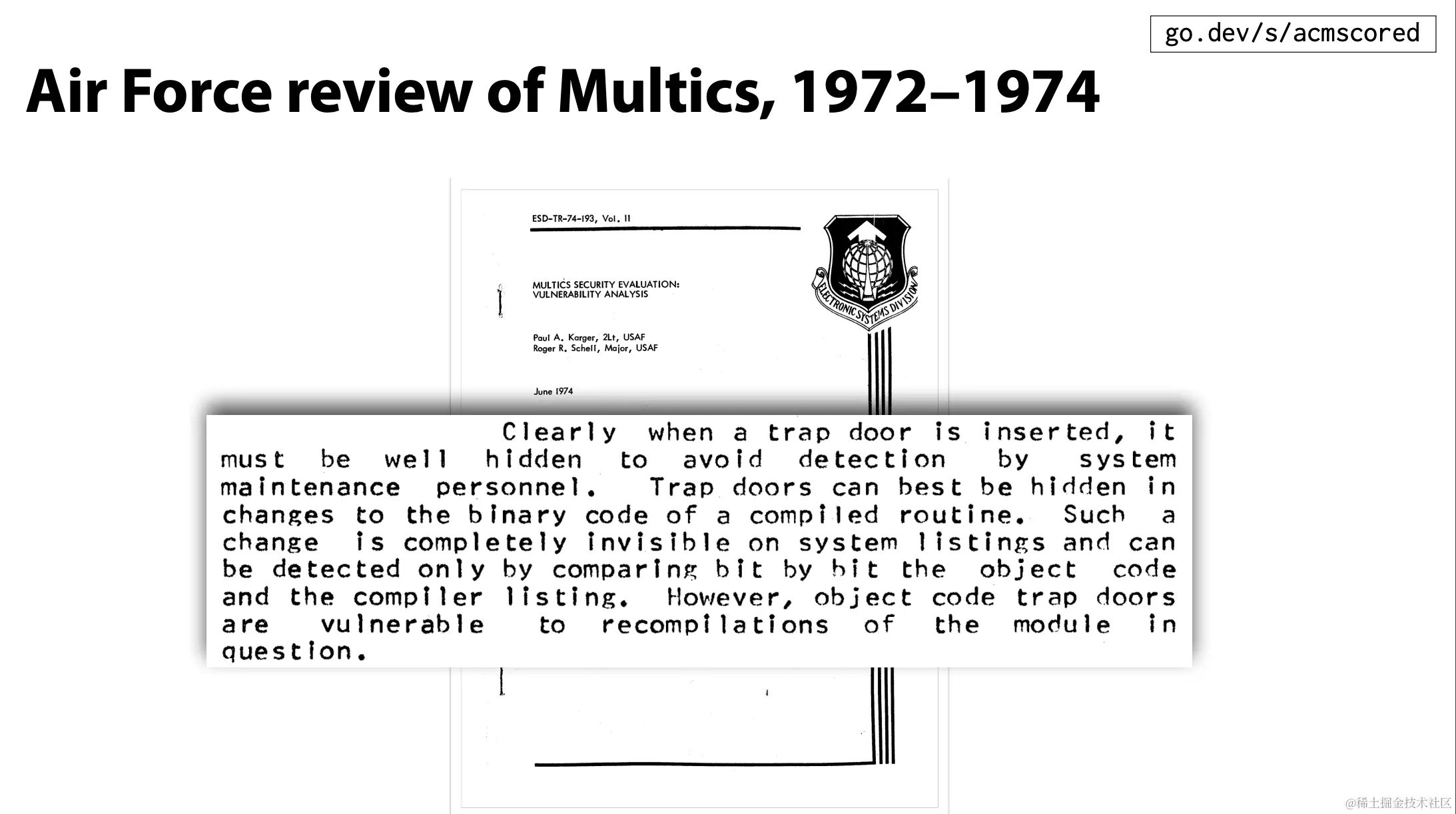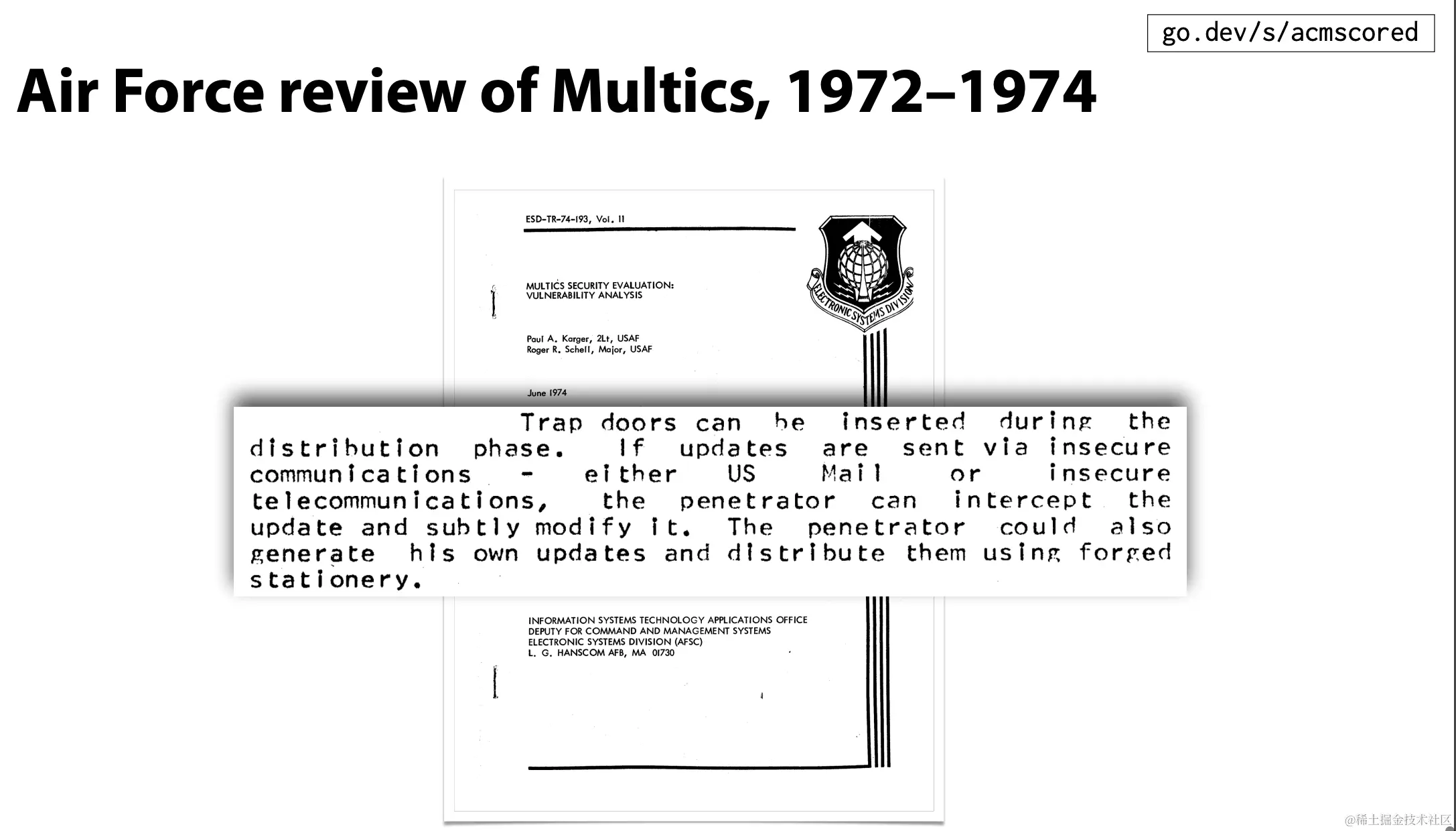 我想进一步缩小范围,看看1972年3月美国过去半个世纪的开源供应链安全。当时,美国空军开始对霍尼韦尔Multics系统进行审查,以了解其是否可以在安全环境中使用。1974年中期发布的报告得出结论,Multics并不安全,但比同类系统更好。