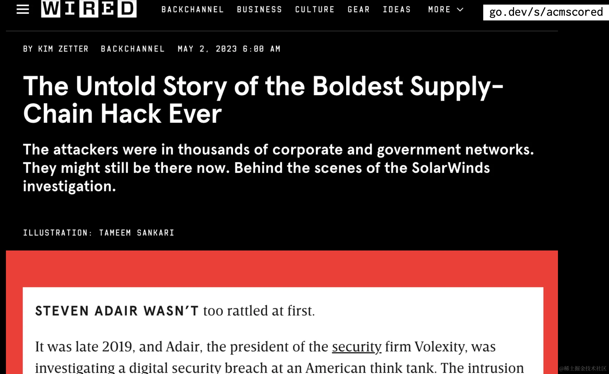 2019年9月,疑似来自俄罗斯的黑客组织闯入了名为SolarWinds的公司的构建服务器,当Orion更新时(译者注:该一个网络管理平台),他们将恶意代码注入到SolarWinds监控软件的构建中,该黑客组织获得了对多个政府敏感网络的访问权限。