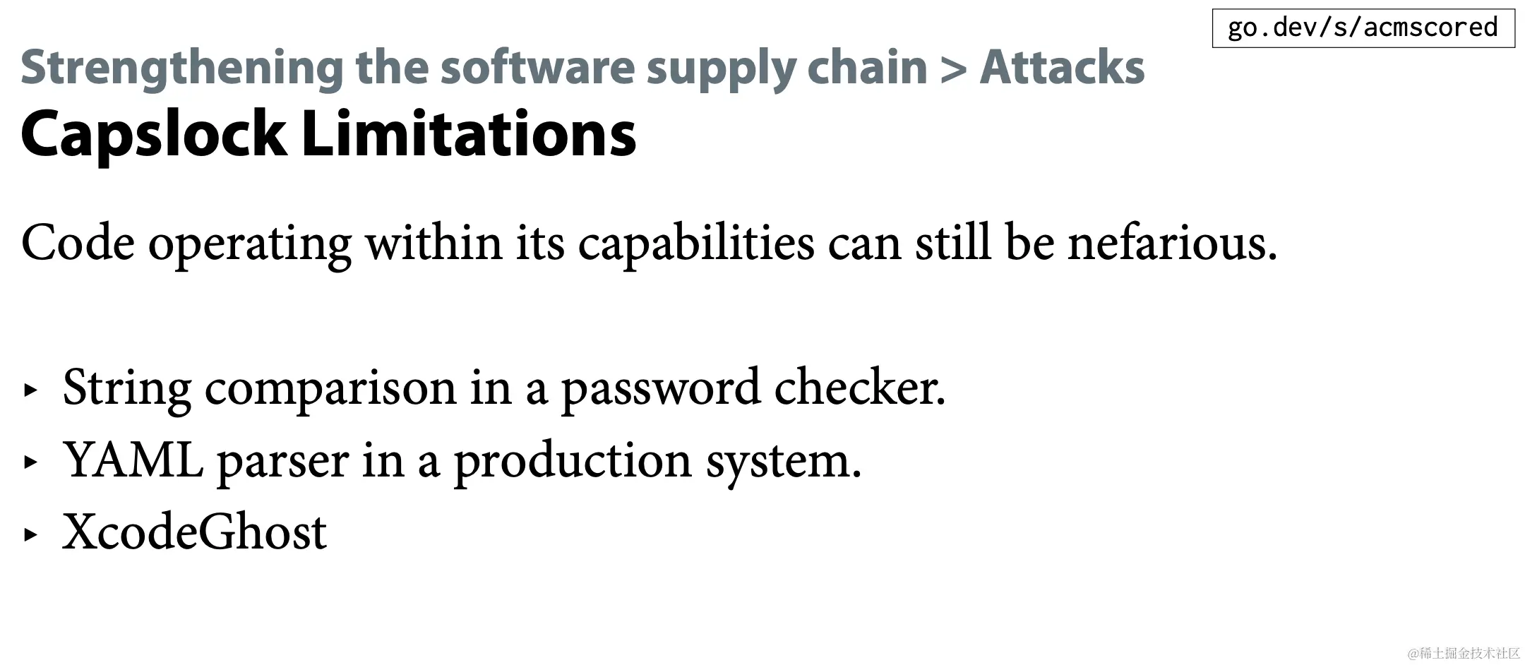 Caps Lock的限制之一是,即使在它的预期功能范围内,通用代码系统仍然可能执行恶意操作。例如,如果你控制了作为依赖项的yaml解析器,你可能会找到办法调整解析器返回的配置,从而改变访问控制列表或防火墙规则。Xcode Ghost就是一个例子,它在系统调用或其他功能级别上没有做任何与普通Xcode不同的事情,但却改变了它编译的程序的含义。